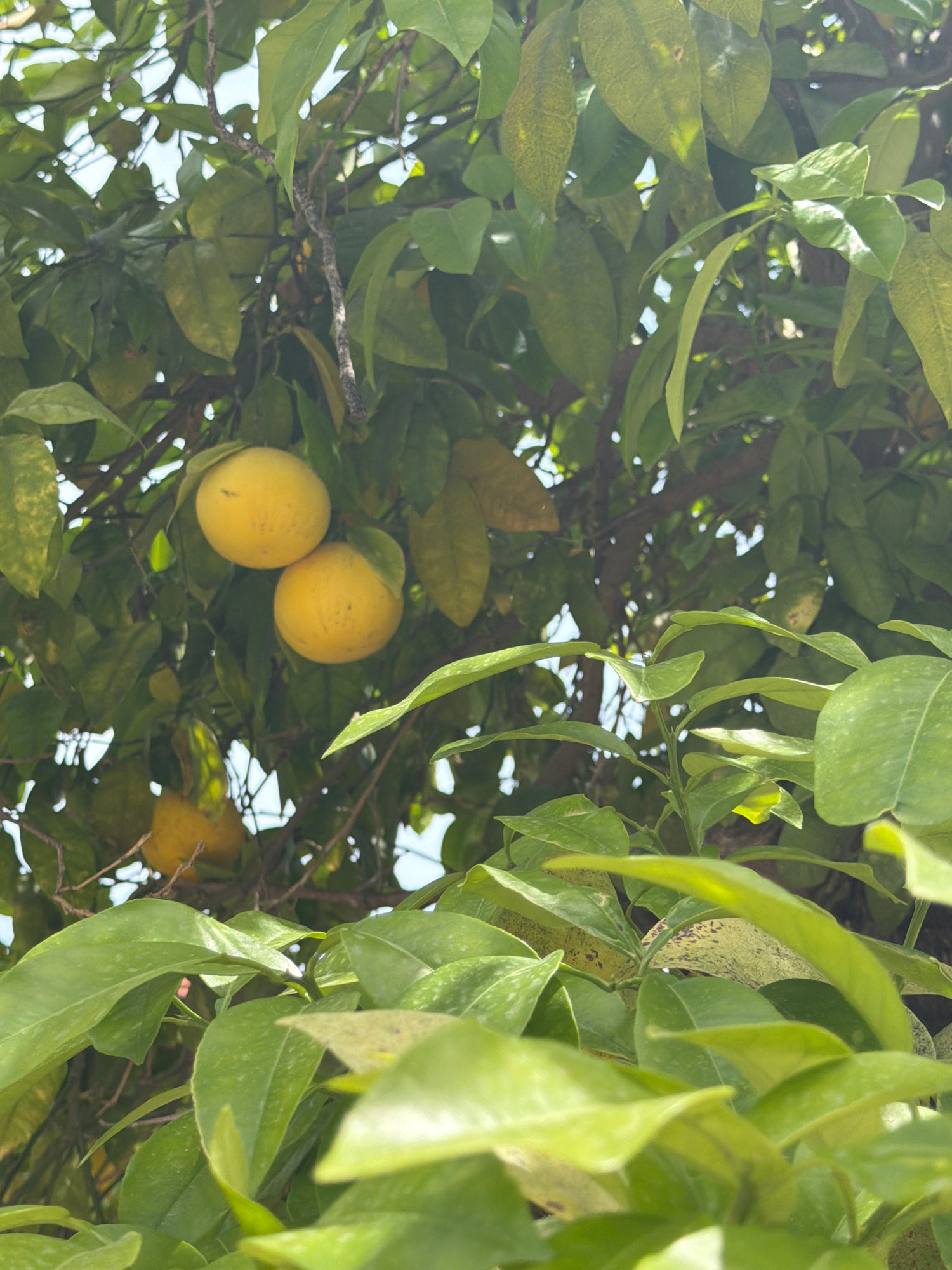 The image shows a close-up view of a tree with green leaves and yellow fruit, likely oranges or lemons. The leaves are dense, creating a shaded area. There are two visible yellow fruits clustered toge…read more