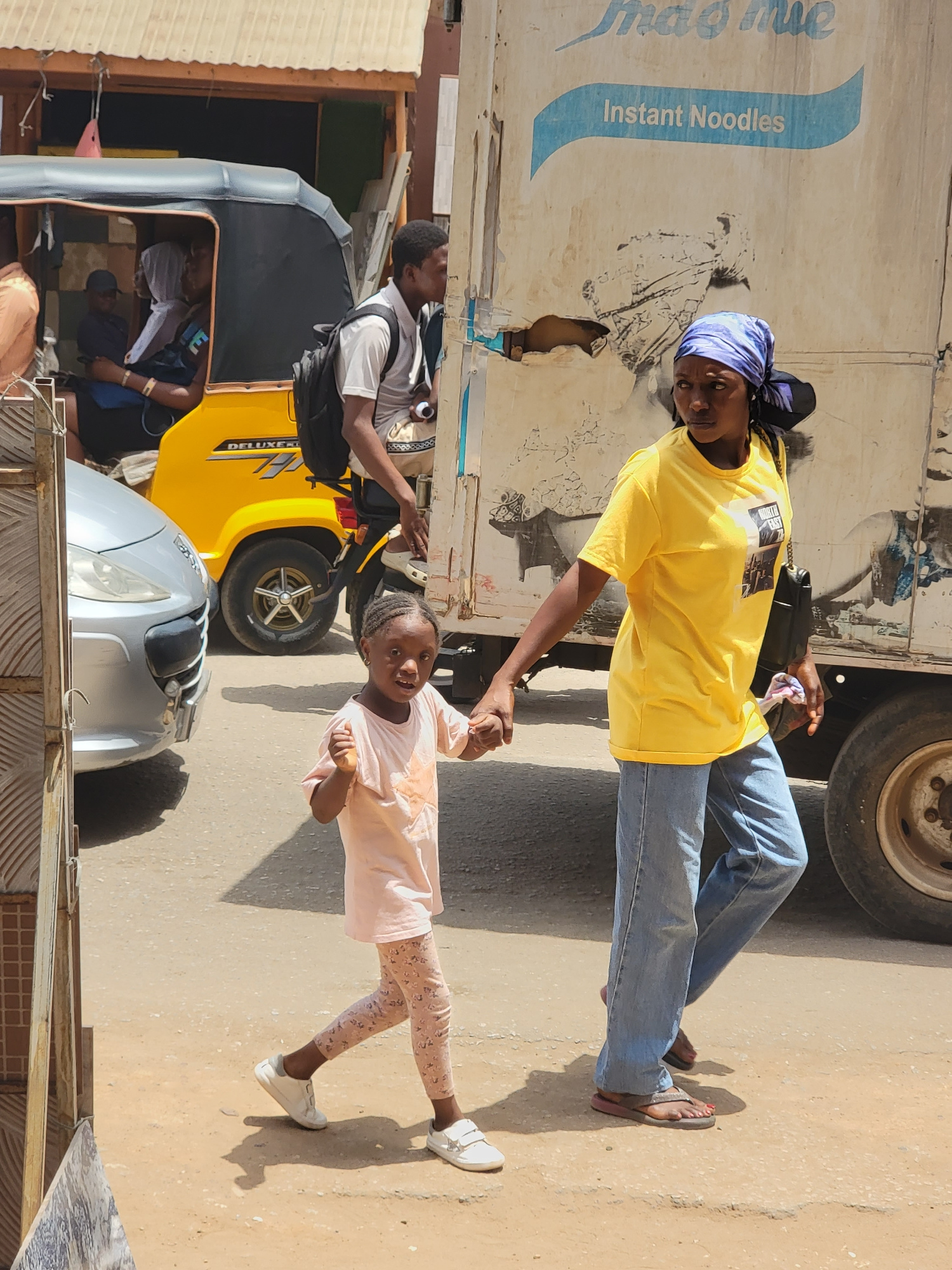 A woman in a yellow t-shirt and blue jeans holds the hand of a young girl wearing a light pink shirt and patterned leggings in what appears to be a street scene in Maiburiji, Nigeria. The woman is sta…read more