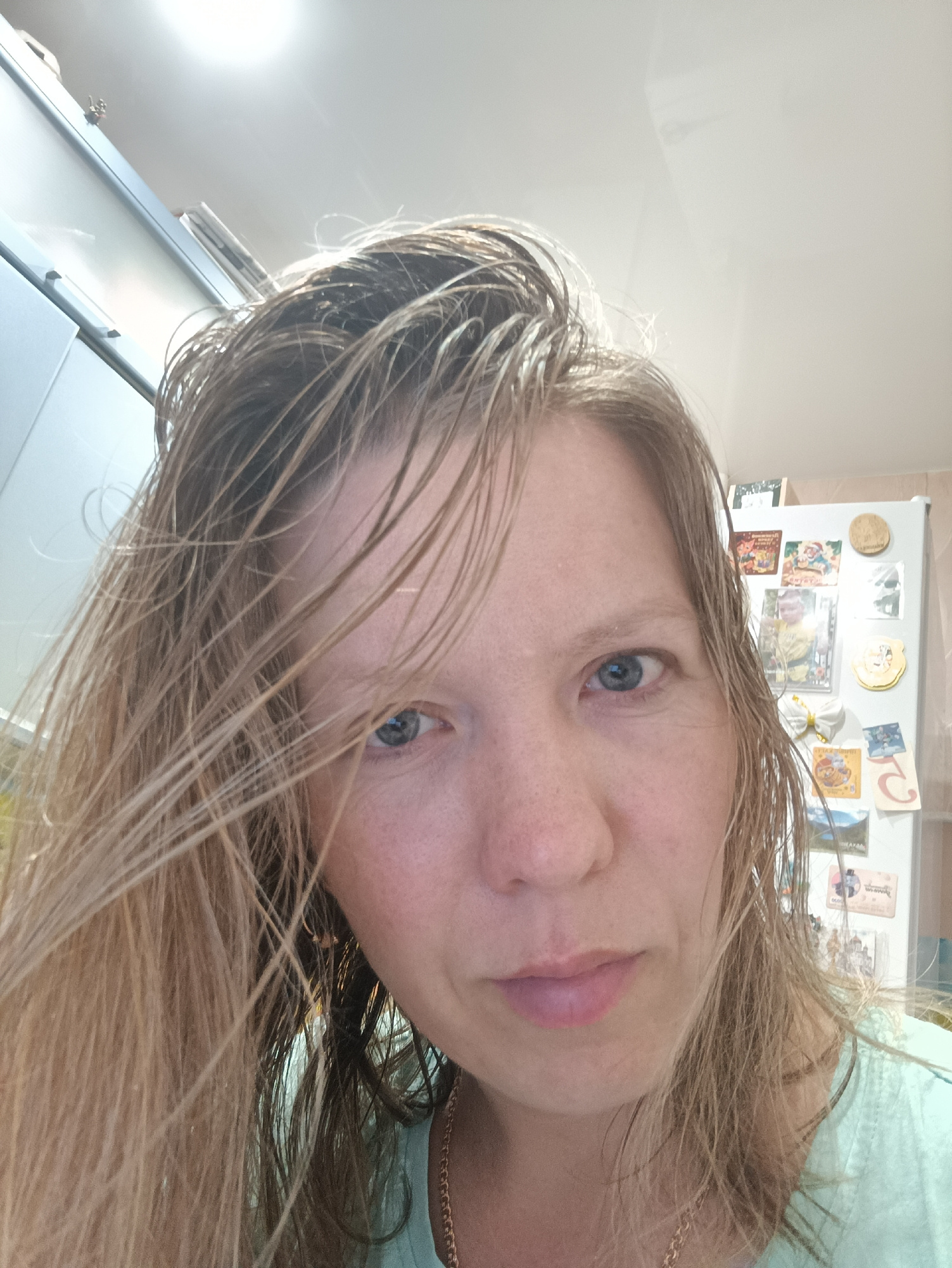 The image is a close-up selfie of a woman with wet, blonde hair. Her eyes are blue and she has fair skin with freckles. She is wearing a light green shirt and a gold necklace. The background suggests…read more