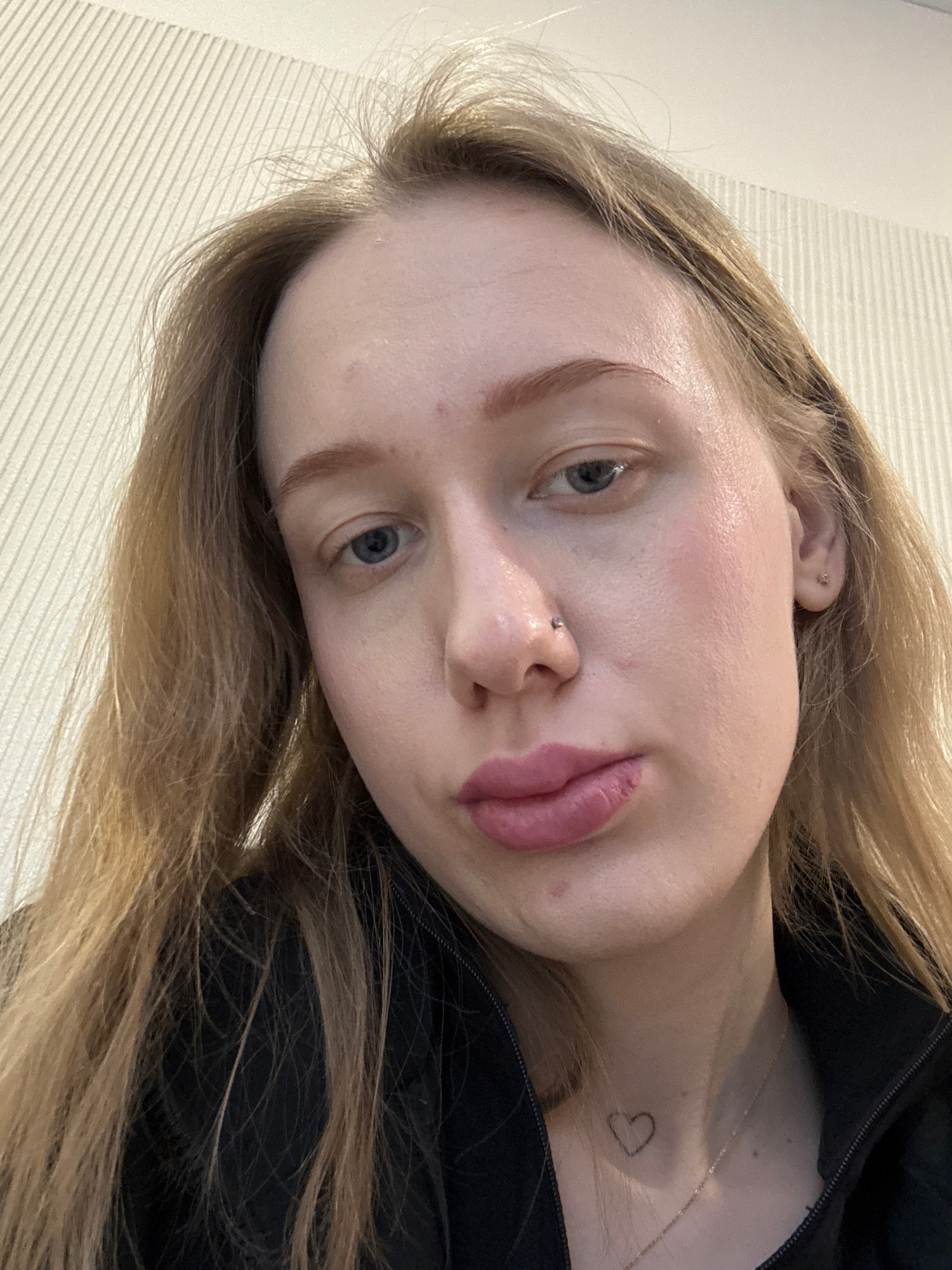 A selfie of a fair-skinned young woman with blonde hair and blue eyes. She has piercings in her left nostril and left ear. She is wearing a black jacket and a necklace with a small heart tattoo visibl…read more