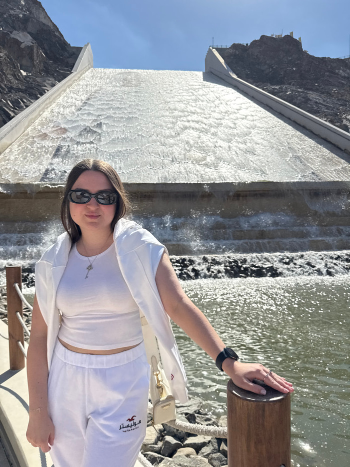The image displays a young adult female standing outdoors at the Hatta Dam spillway in Hatta, United Arab Emirates, under a clear blue sky. The female, positioned slightly off-center to the left, has…read more