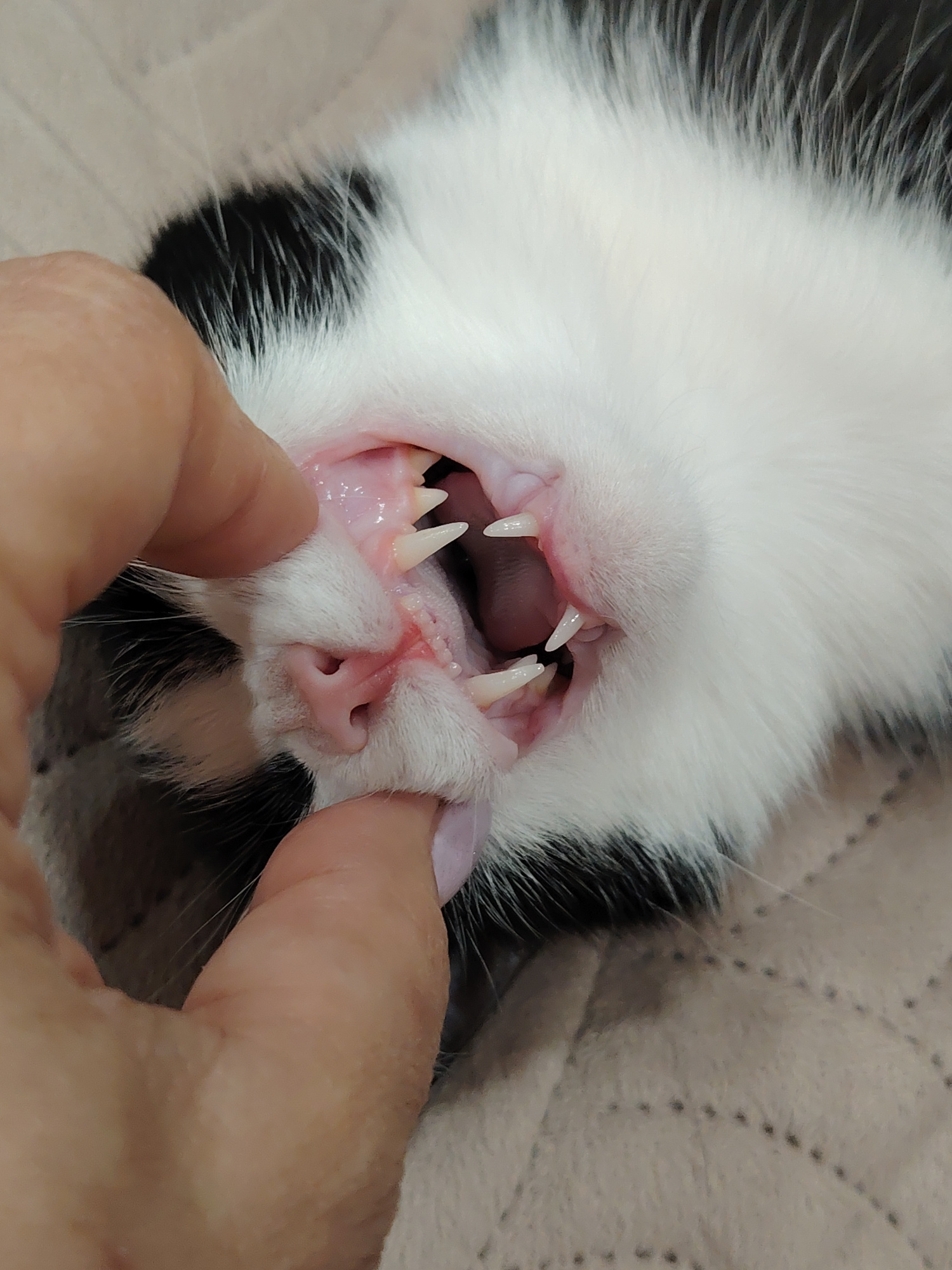 The image shows a close-up view of a black and white cat's mouth being examined by a person's hand. The cat's sharp teeth are visible, and the person's fingers are used to pull back the cat's lips, re…read more