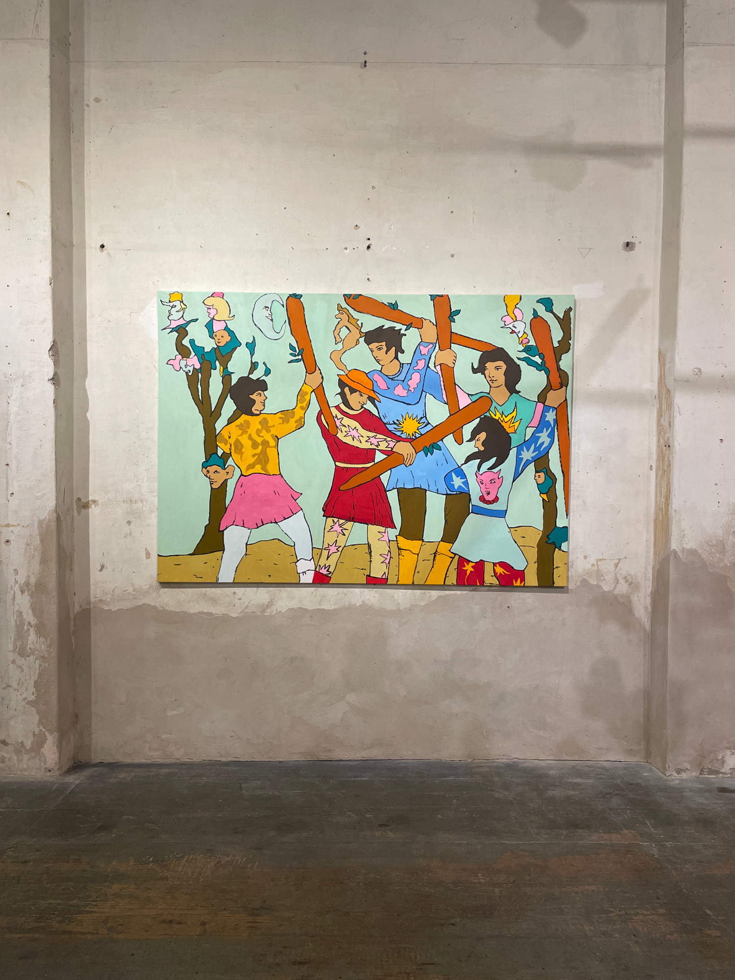 A painting hangs on a light-grey concrete wall. The painting is of figures holding tree branches. The figures are of different skin tones. The background of the painting is mint-green. The painting is…read more