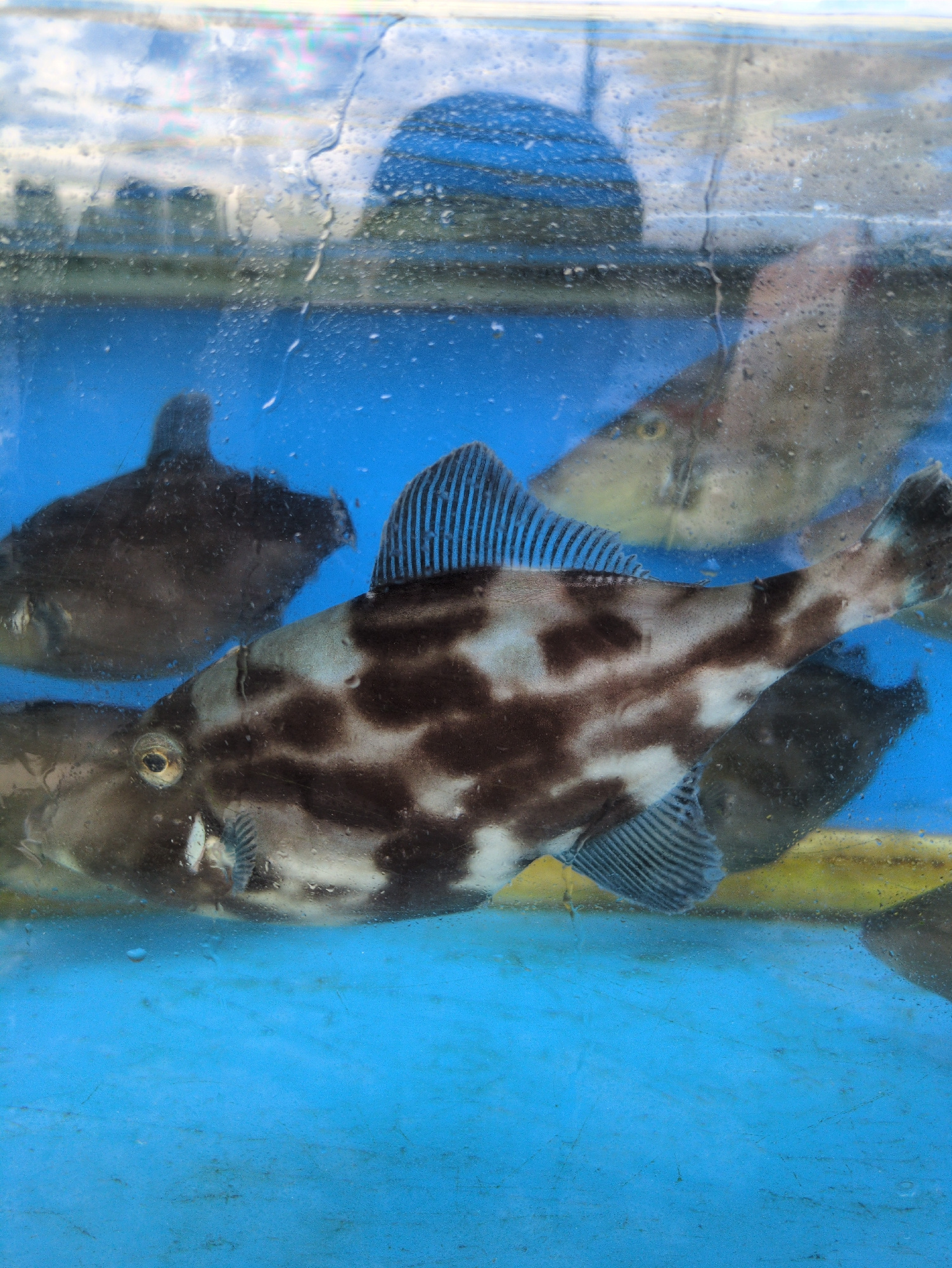 Several filefish swim in a blue tank. The fish are light-colored with brown and white spots. The location is presumed to be in Busan, South Korea.