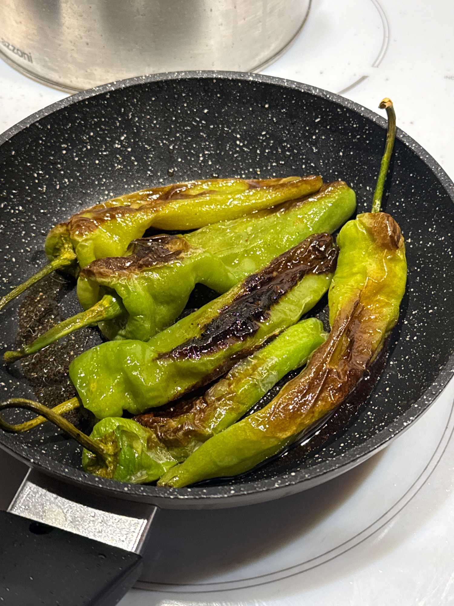 A close-up, high-angle shot depicts several elongated green peppers cooking in a black, speckled non-stick frying pan. Approximately six to seven peppers are visible, displaying varying degrees of cha…read more
