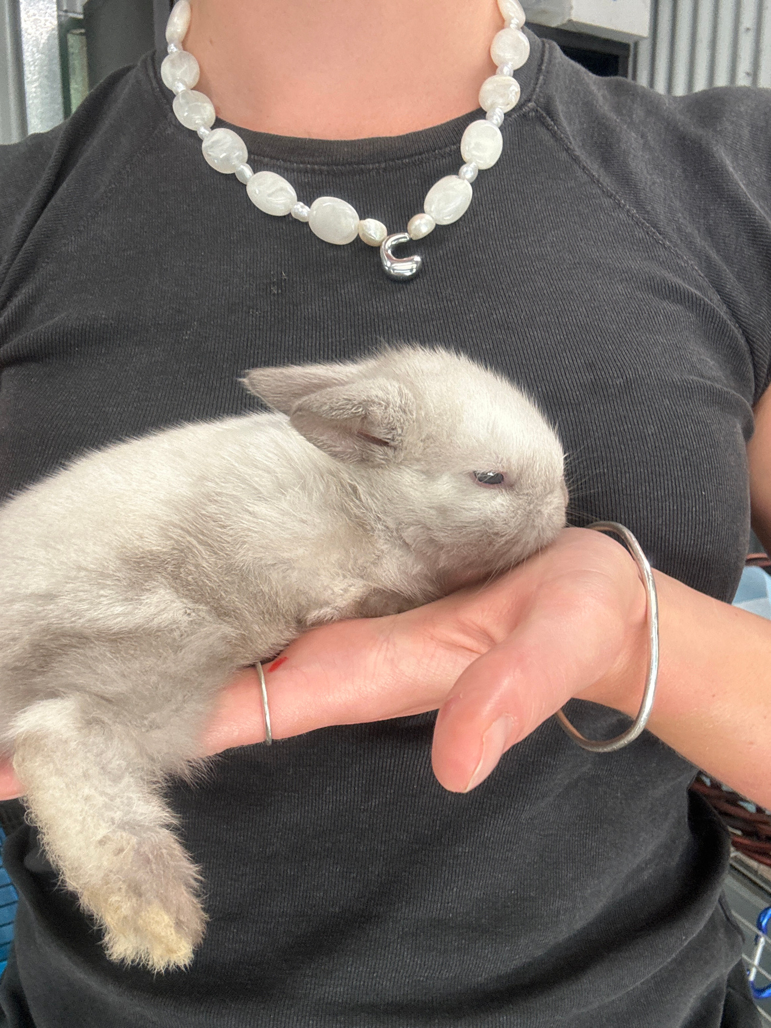 In Russell Vale, Australia, a close-up image captures a human subject holding a small rabbit. The human, of indeterminate gender, wears a black, short-sleeved, ribbed crew-neck top. A necklace adorns…read more