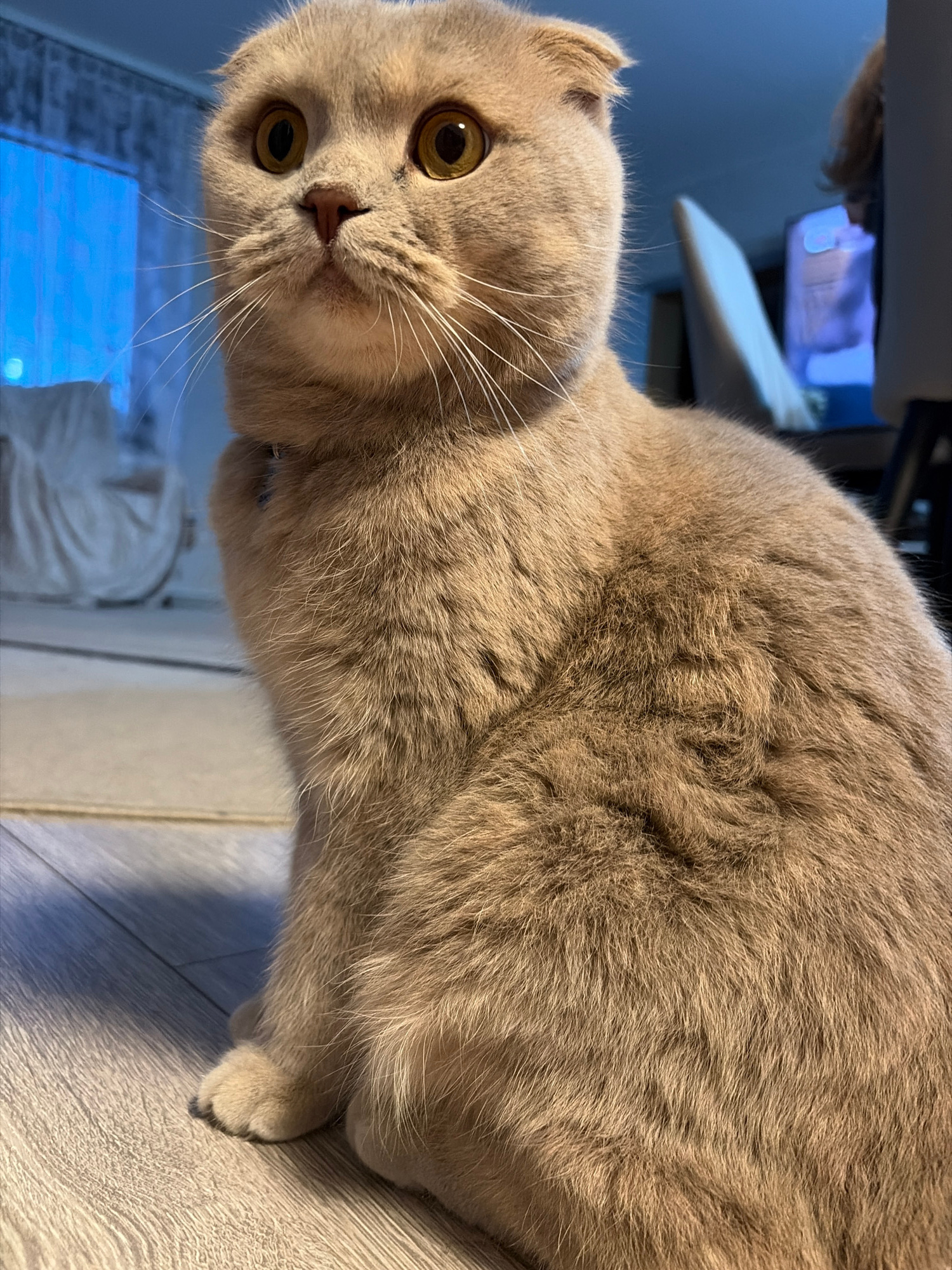 A close-up, angled shot features a light brown Scottish Fold cat. The cat is positioned in front of a blurred background containing a desk, a blue box, and a portion of a window with a blue cast. The…read more