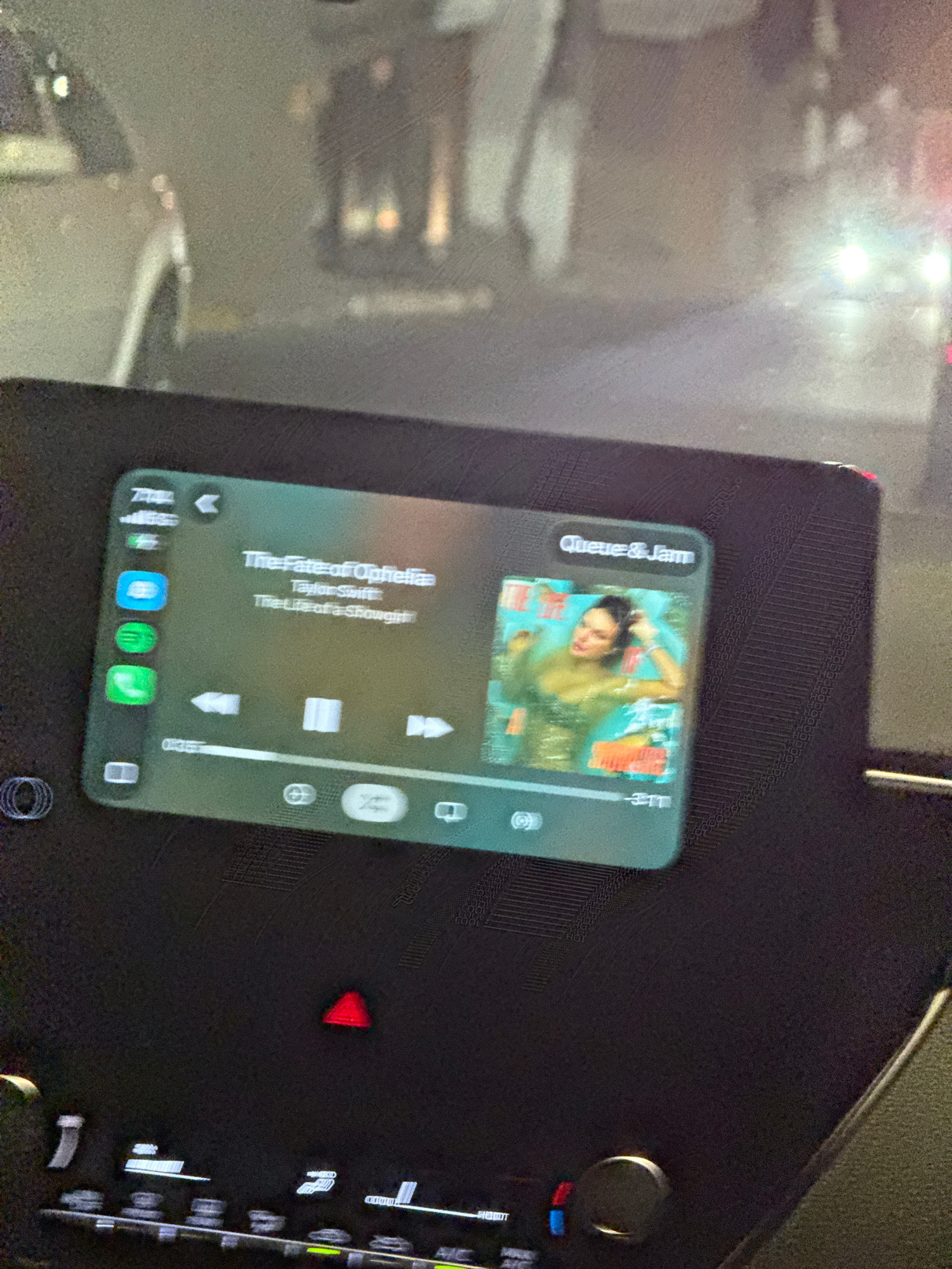The image shows a car dashboard with the infotainment screen displaying music being played. The song is "The Fate of Ophelia" by Taylor Swift, from the album "The Life of a Songwriter". The music app…read more