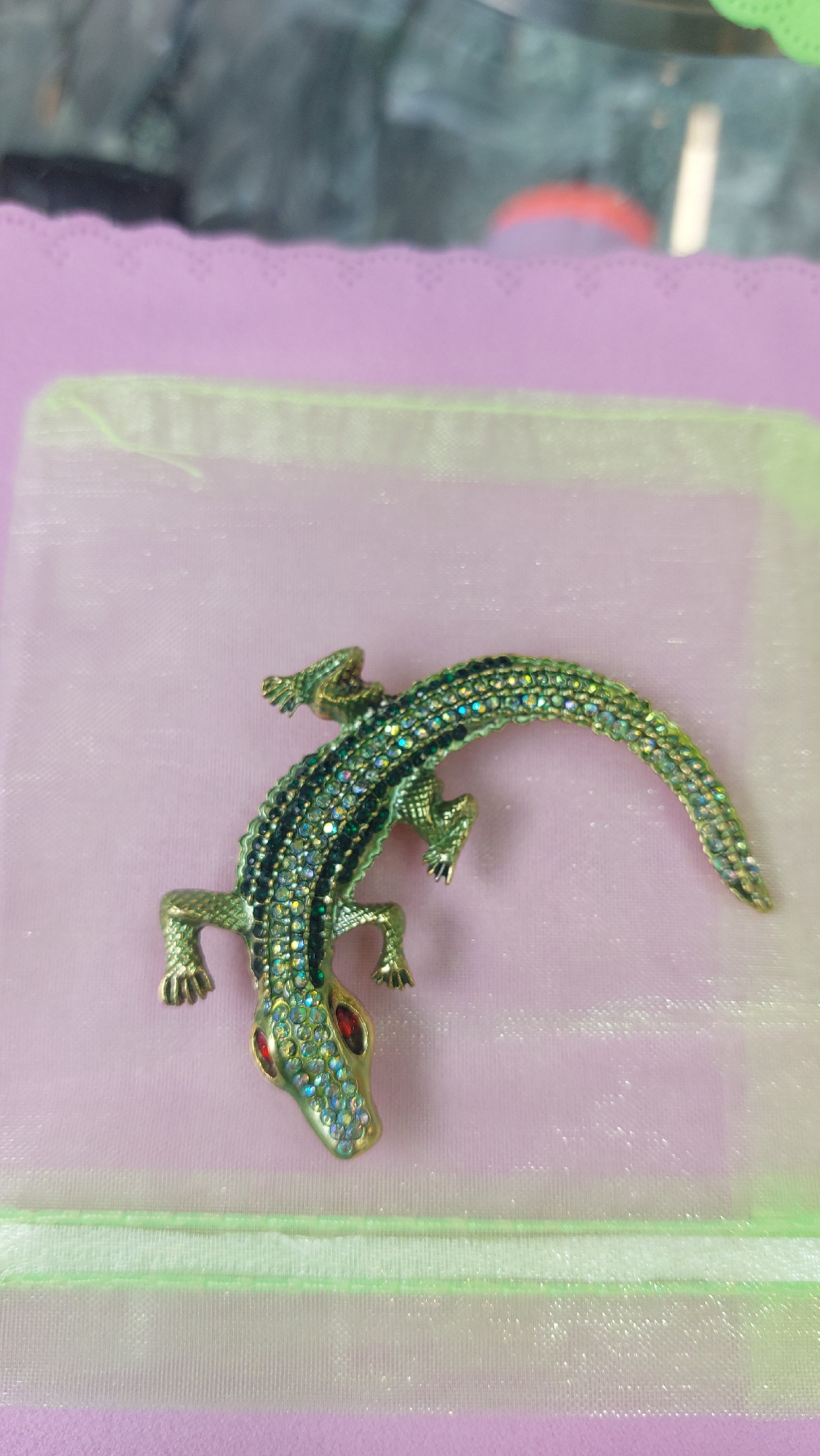 A close-up photograph features a decorative, gold-colored alligator brooch or pin, covered with sparkling stones. The alligator is placed on a pink and semi-transparent white fabric. Part of a purple…read more