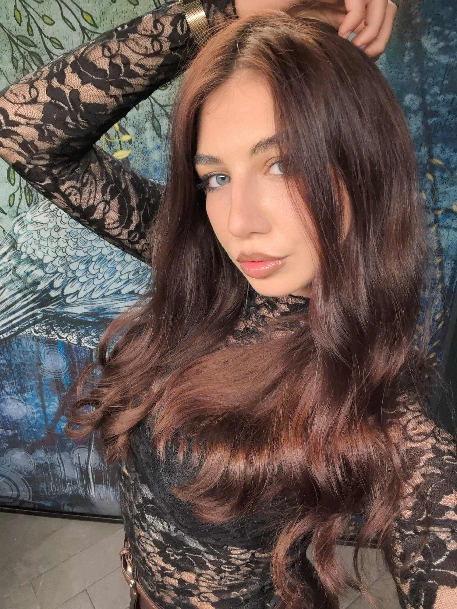 A woman with light blue eyes and long, dark brown hair poses for a selfie. She wears a black lace top with long sleeves and a gold bracelet on her left wrist. Her left arm is raised, with her fingers…read more