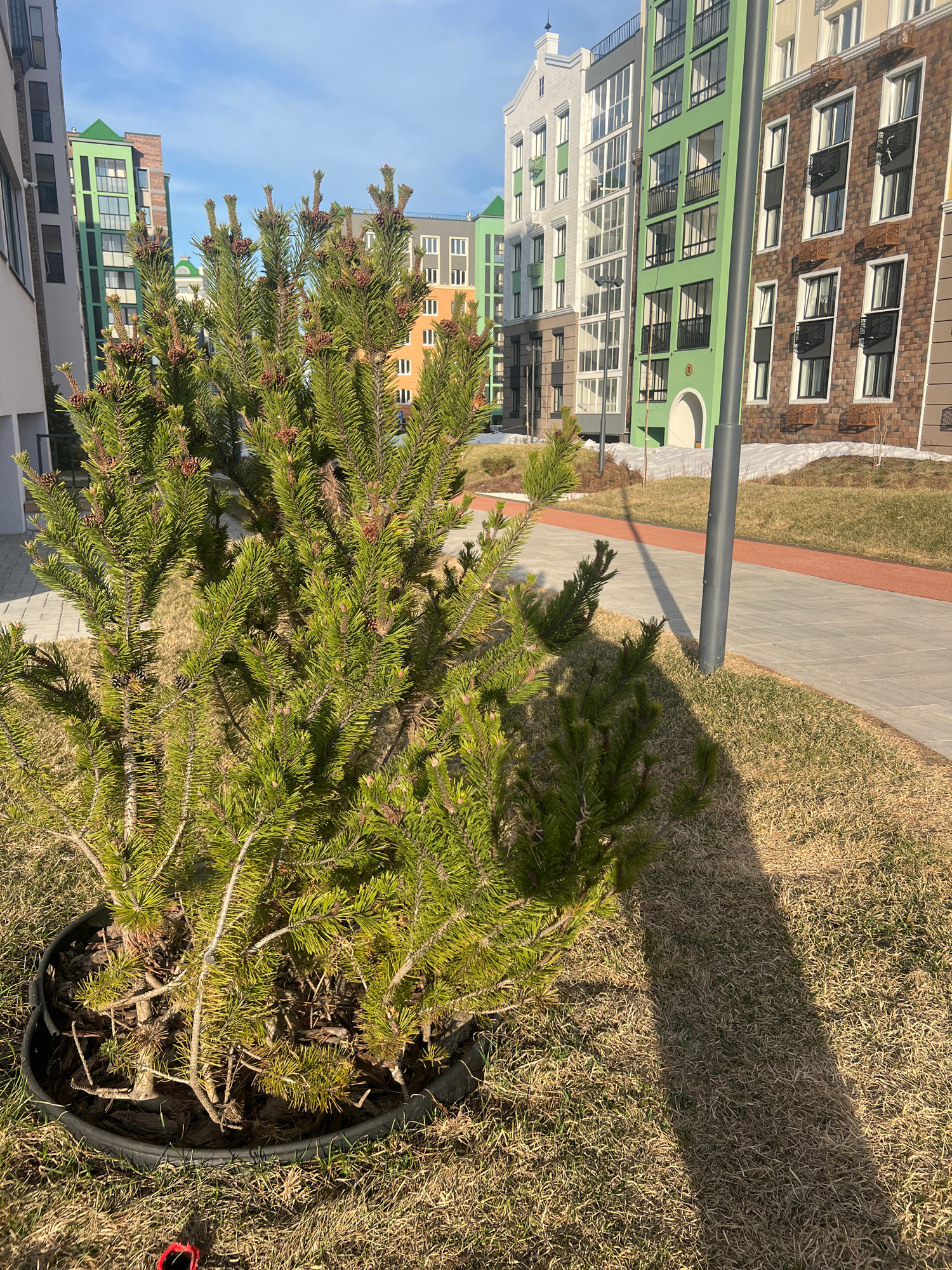 The scene is in Pervomaysky, Russia. A young, potted pine tree sits on dry grass. The pot is black plastic. In the background, a sidewalk curves away from the tree. Behind the sidewalk are several mul…read more
