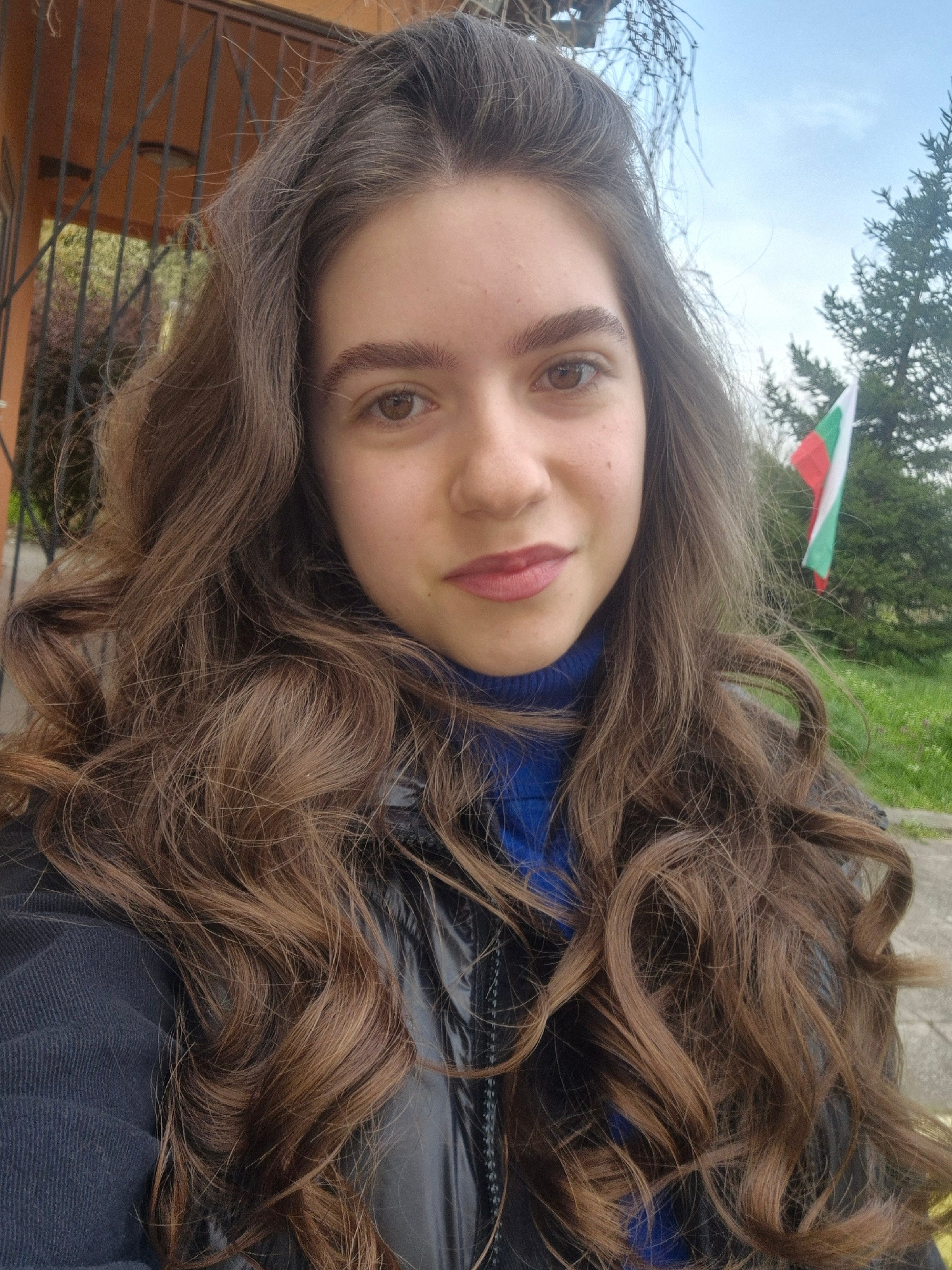 A young woman poses for a selfie outdoors. She has long, wavy brown hair and is wearing a blue top under a black, shiny jacket. In the background, there is greenery, a fence, and a structure possibly…read more