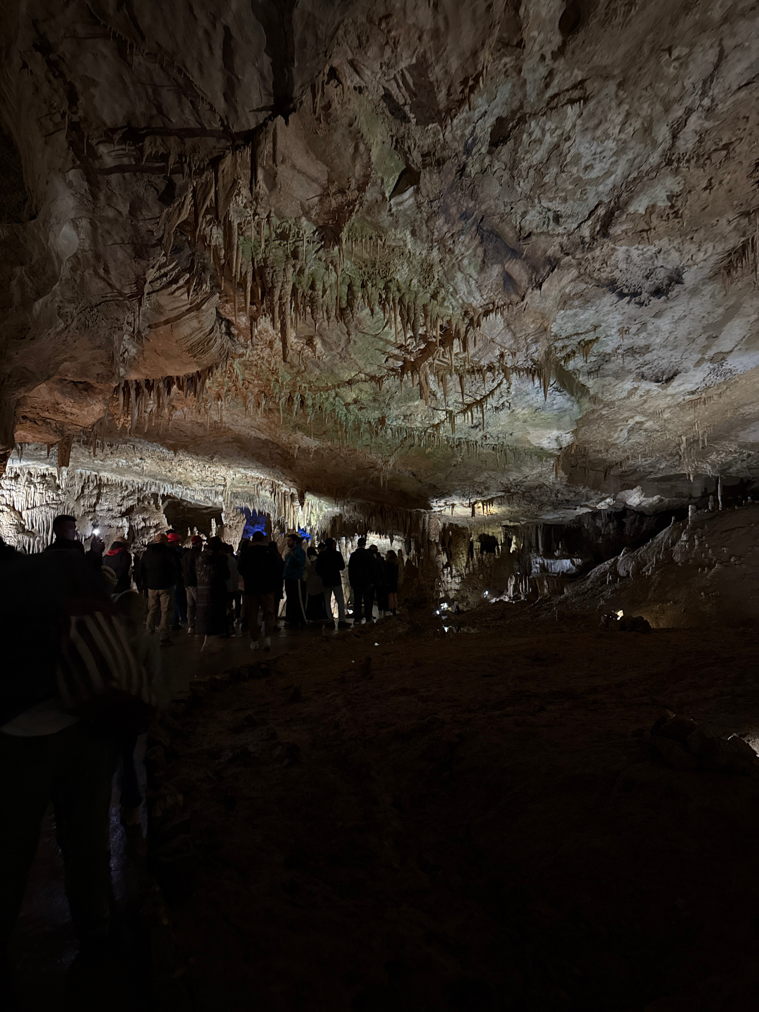 A group of people is walking through the Prometheus Cave in Tskaltubo, Georgia. The cave walls are rough and covered in stalactites and stalagmites. The lighting is dim, with some areas brightly lit a…read more