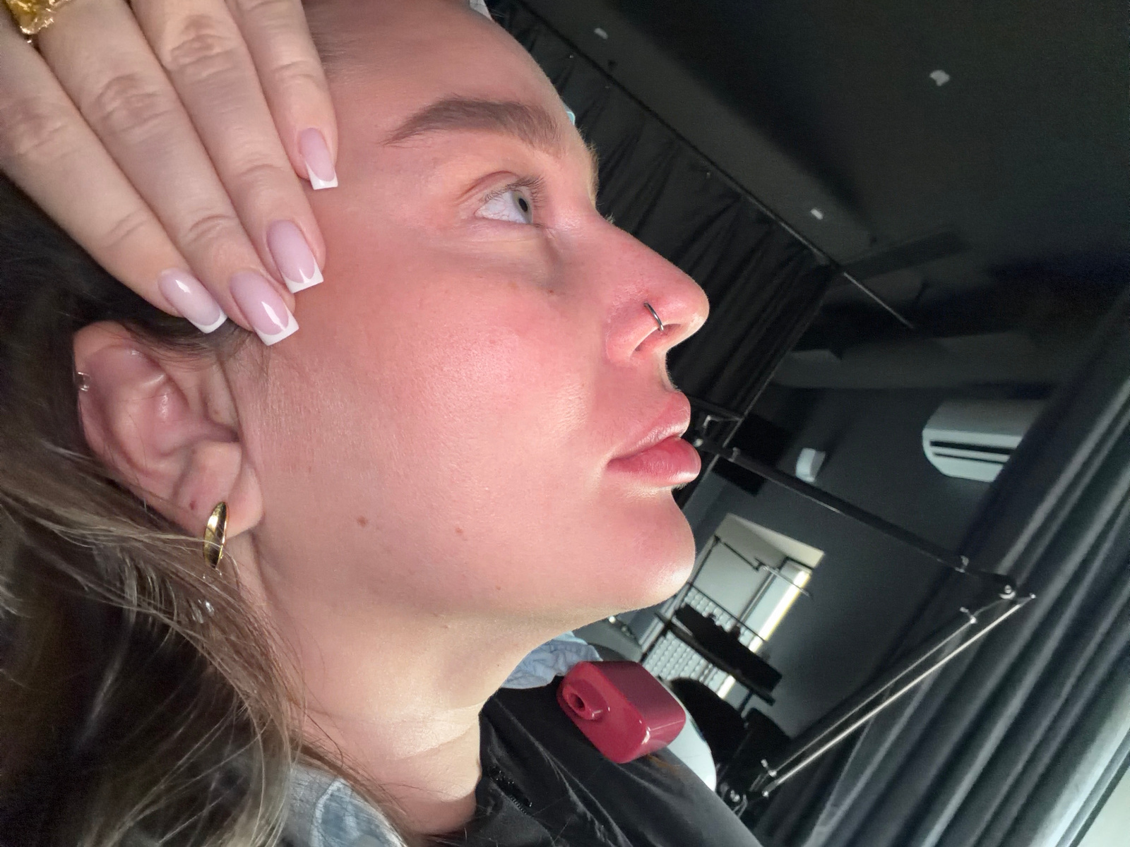 A light-skinned person, possibly female, is the central subject, viewed in profile from the left. They have blonde or light brown hair and fair skin. They have a silver nose ring and gold earrings. Th…read more