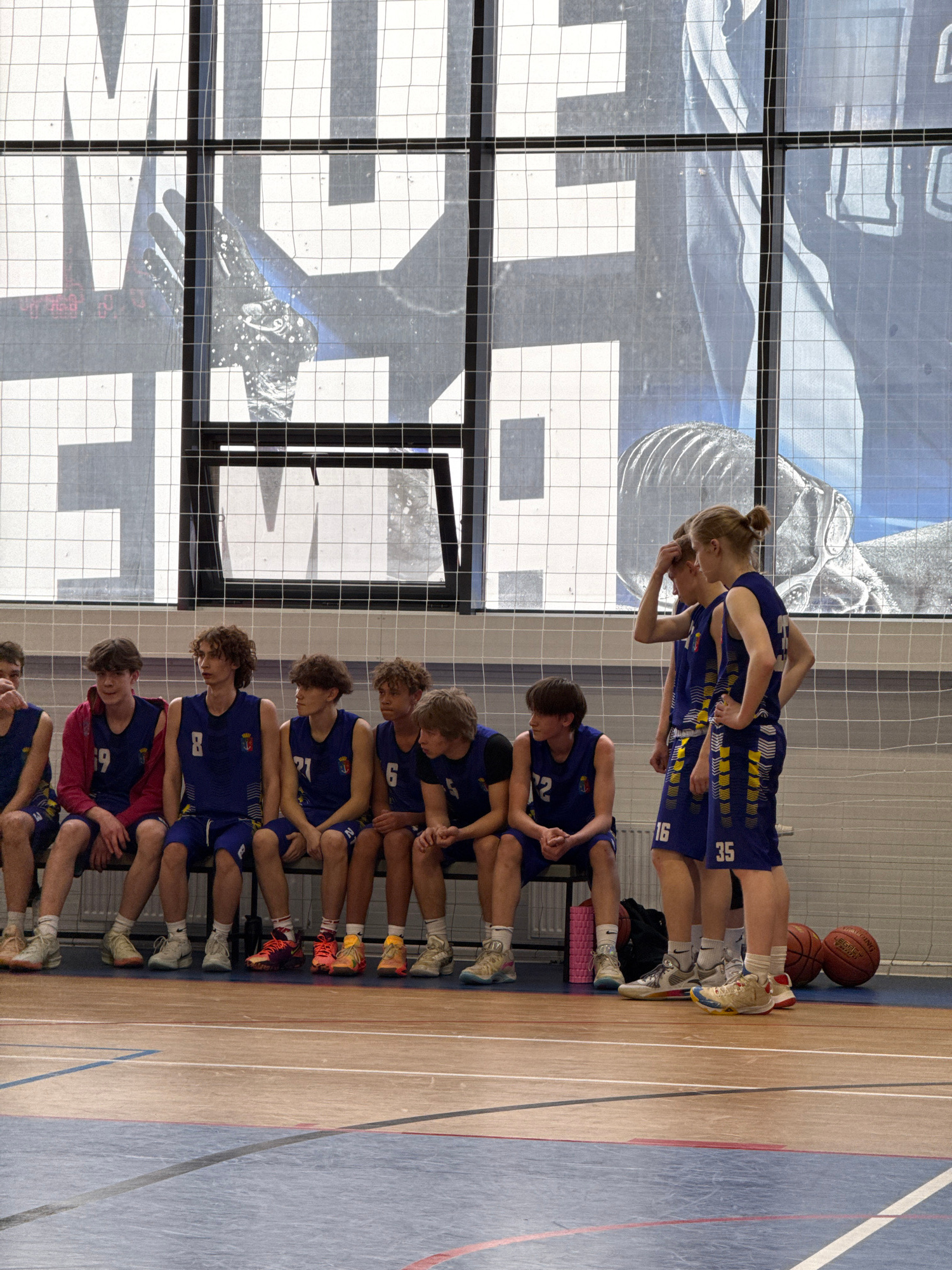 A sports team sits on a bench indoors in Votkinsk, Russia. The players wear blue and yellow uniforms and basketball shoes. Two basketballs rest on the floor. A window is behind the team.