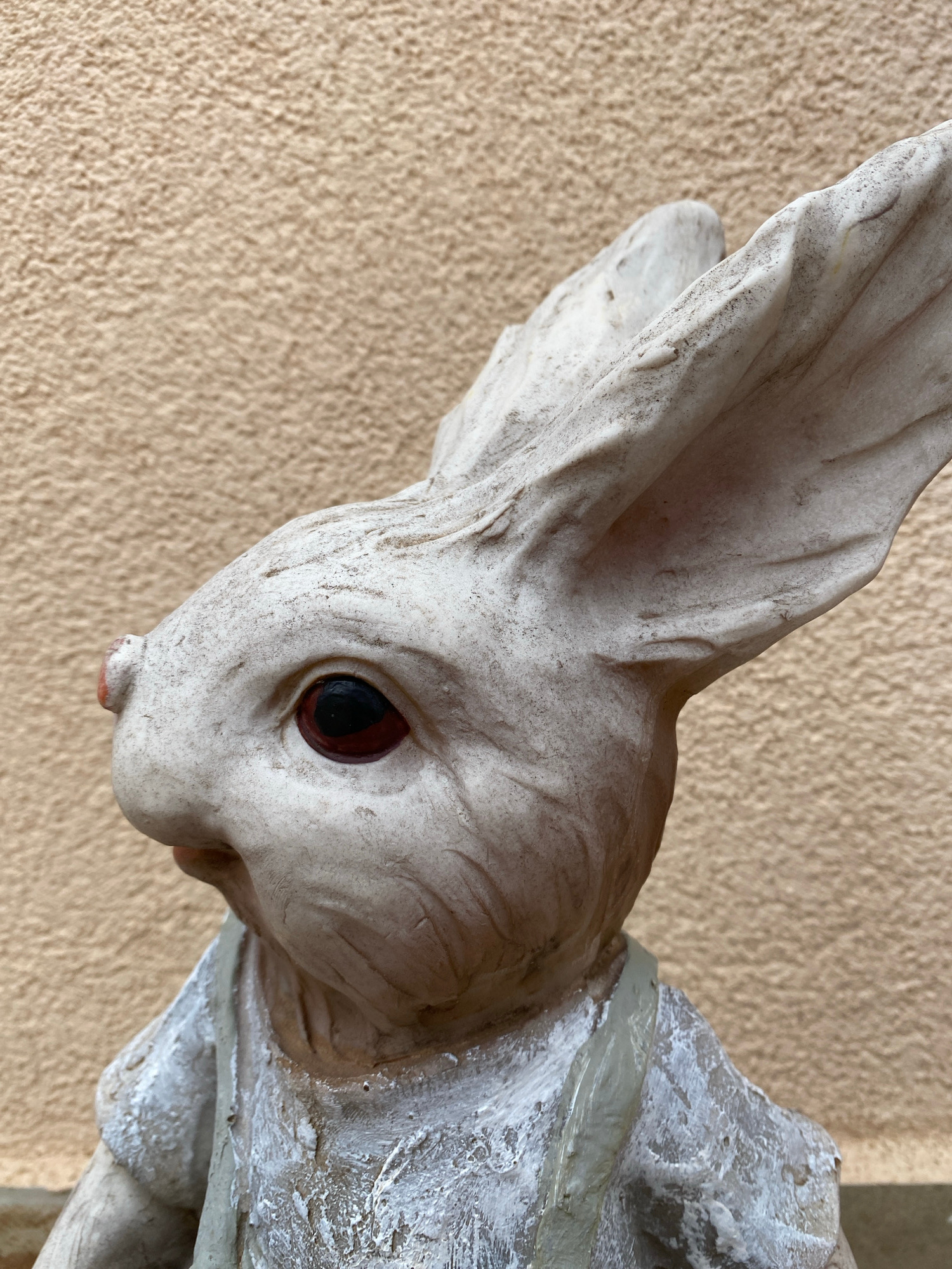A close-up shot shows a weathered, light-colored statue of a rabbit's head and shoulder. The rabbit has one visible, dark eye. The statue's texture shows signs of age and wear. The background is a pla…read more