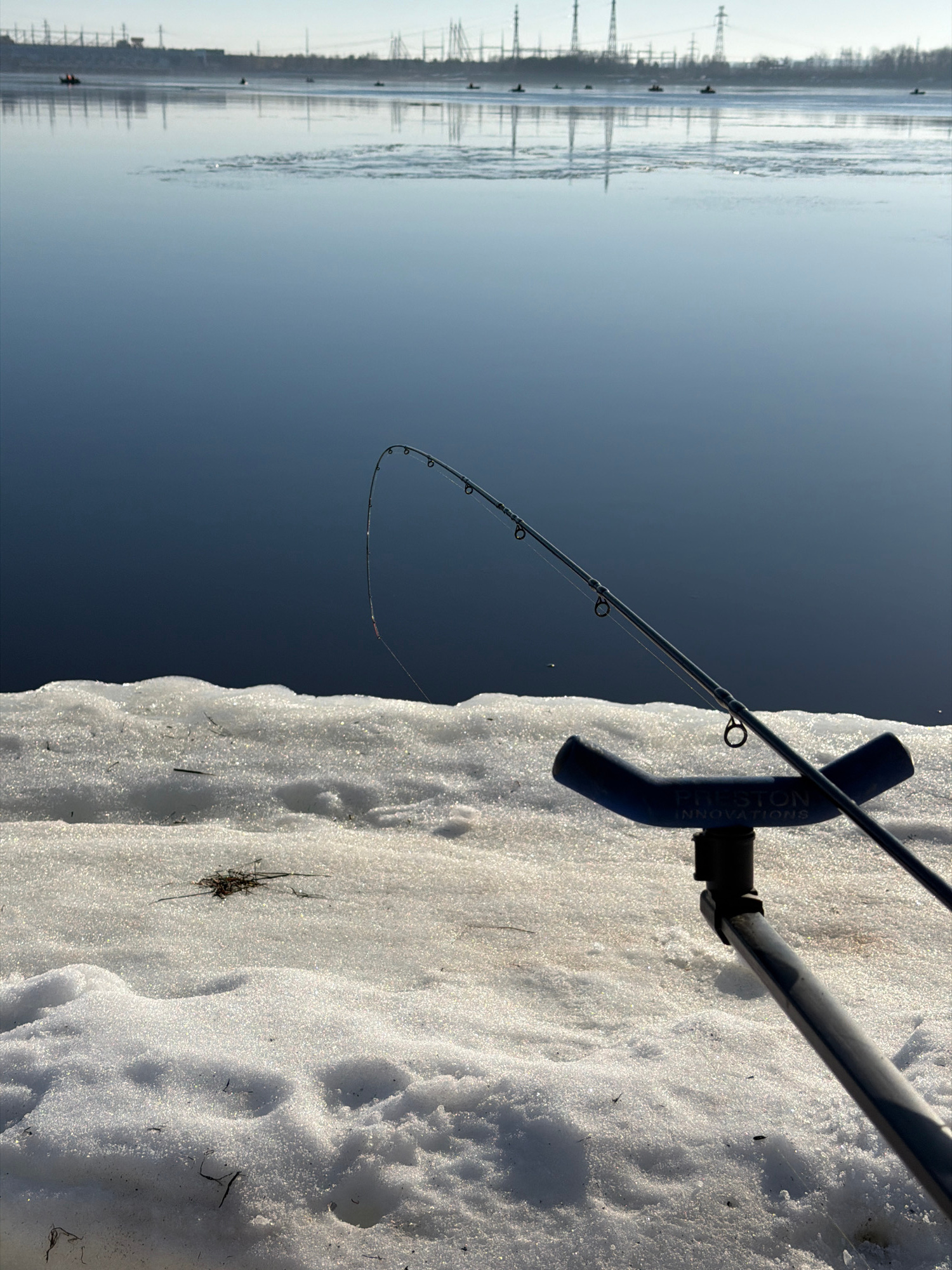 The image shows a fishing rod set up on a snowy bank, with a body of water visible in the background. The rod is supported by a blue rod rest marked "PRESTON INNOVATIONS." The foreground is covered in…read more