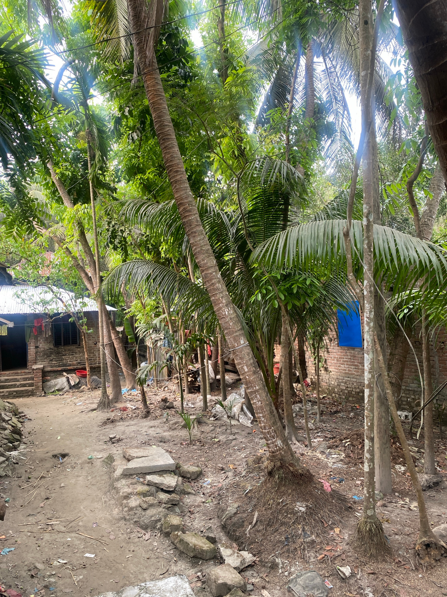 The image shows a scene in an unknown location in Bangladesh. Tall palm trees with green fronds are prominent, partially obscuring the sky. The ground is a mix of dirt, rocks, and scattered trash. Sev…read more