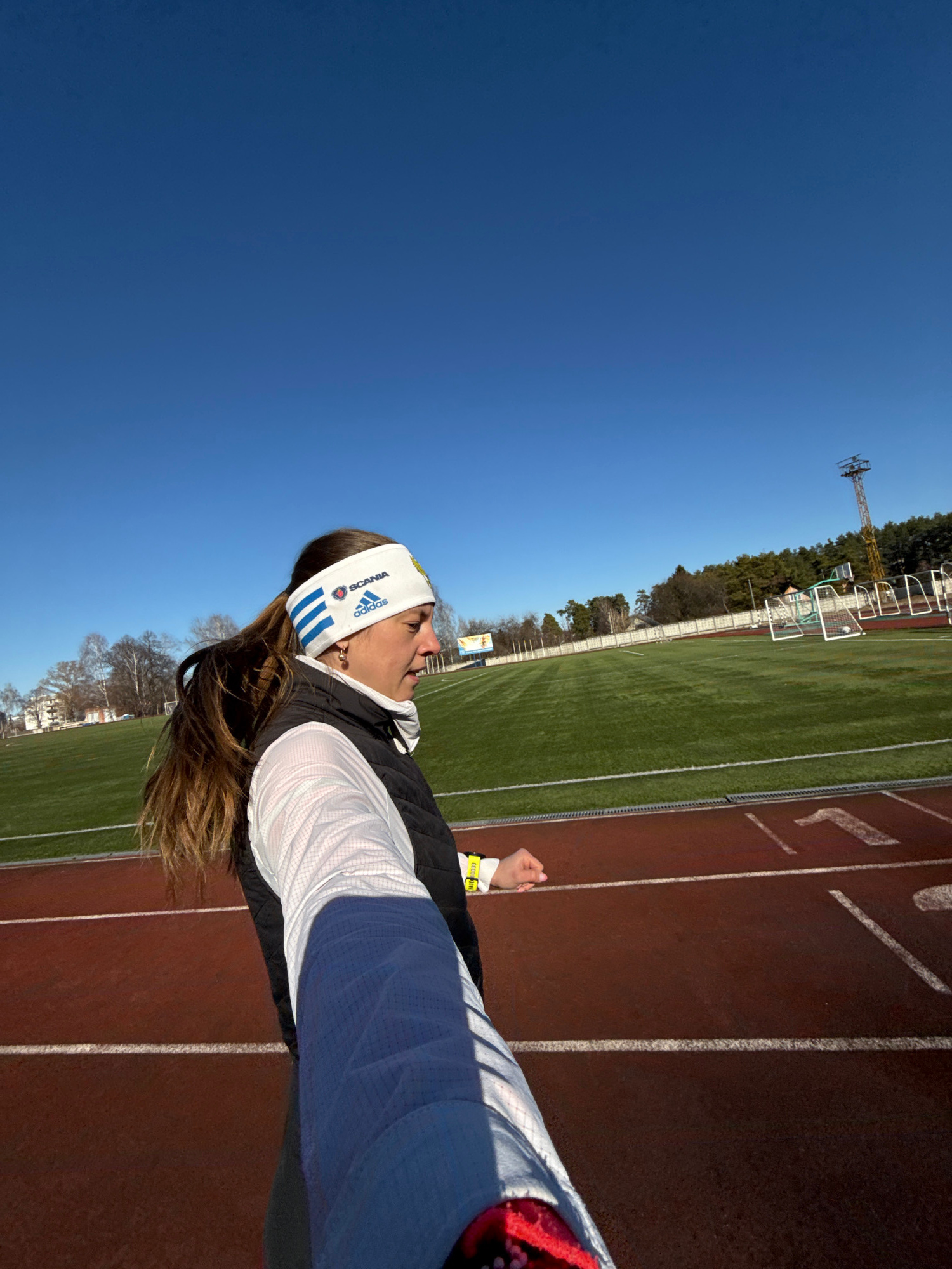 The image captures a woman wearing a white Adidas headband and running attire on a red track, likely part of a sports stadium or training facility. The track is bordered by a green athletic field, and…read more
