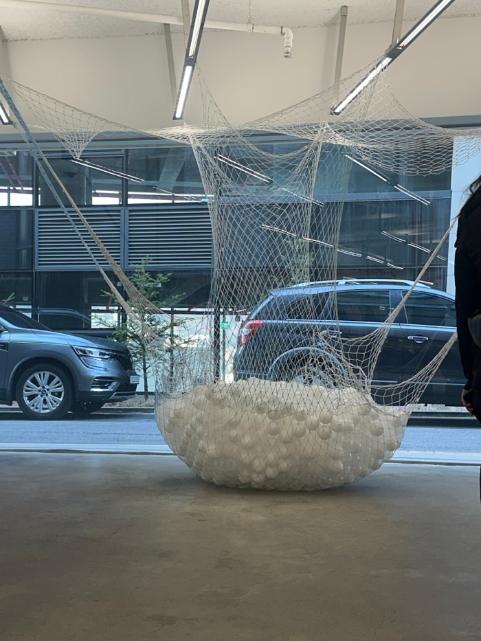 The image presents an interior view looking through a large glass window onto an urban street in Seoul, South Korea. A contemporary art installation dominates the indoor foreground, consisting of an e…read more