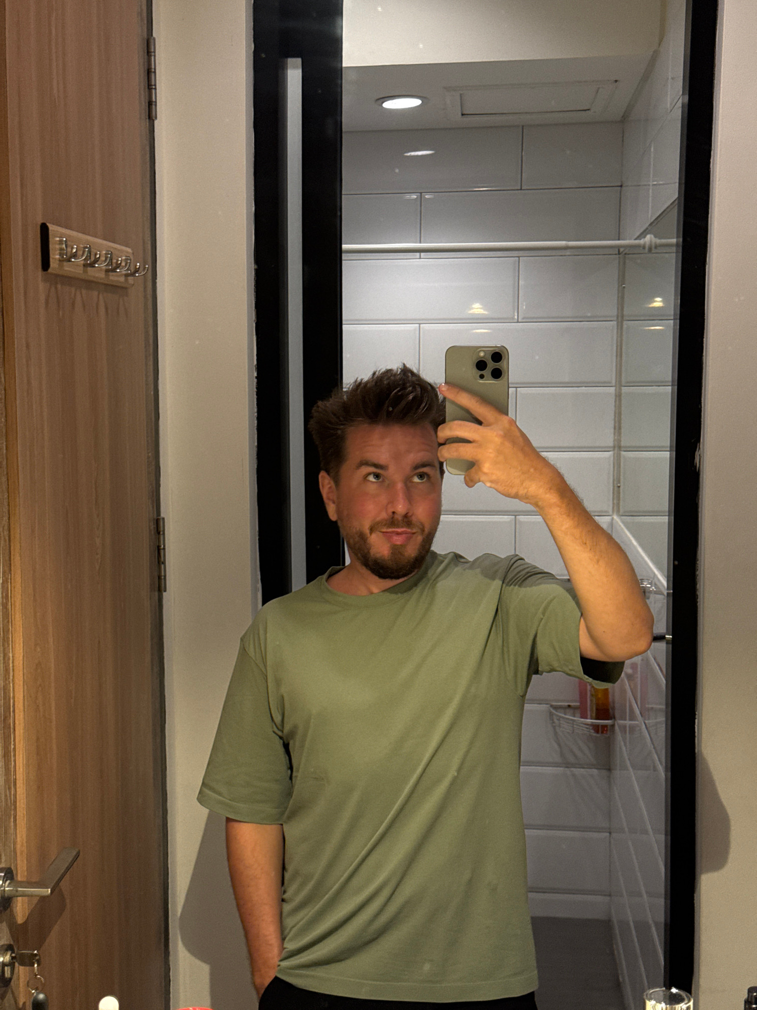 A Caucasian male with short brown hair and a beard is taking a selfie in a bathroom mirror. He is wearing a green t-shirt and holding an iPhone. The bathroom has white tiled walls and a wooden vanity…read more