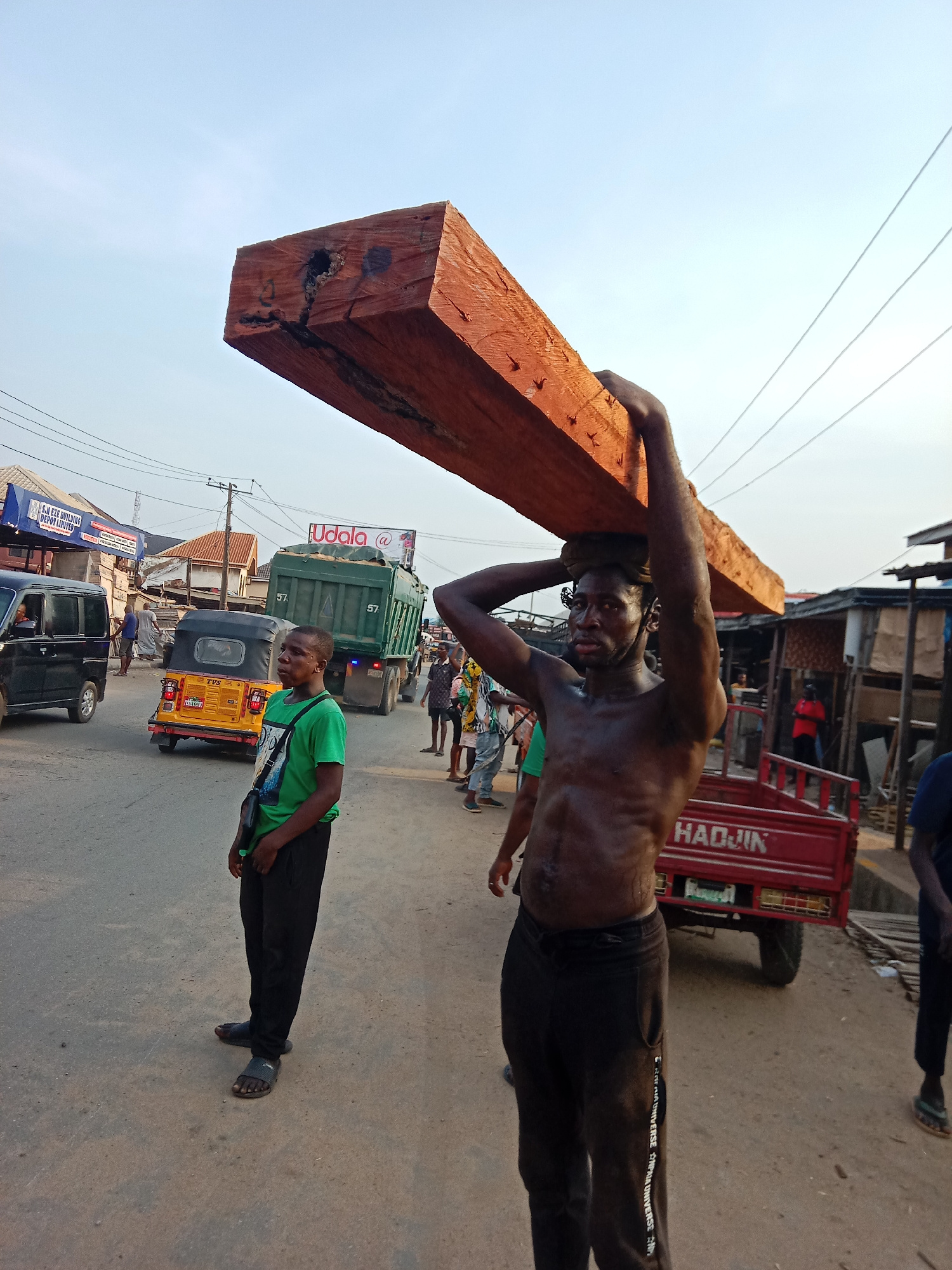 The photograph depicts a street scene in Fegge, Nigeria. A shirtless, dark-skinned man carries a large, rectangular wooden beam on his head, his arms raised to support it. He is wearing dark-colored s…read more