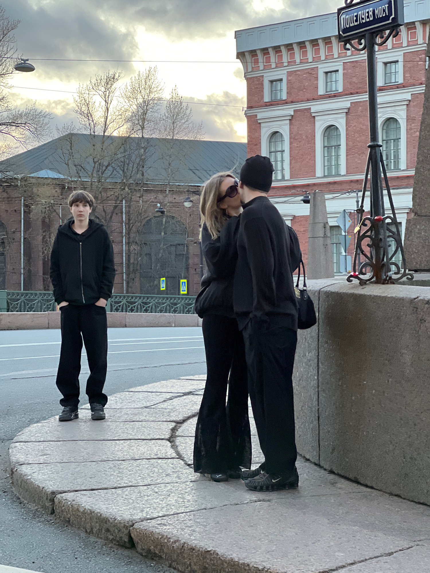 On the embankment in Saint Petersburg, Russia, a young couple dressed in black shares a kiss near a bridge adorned with the street name "Поцелуев мост" (Potseluev Most), which translates to "Kissing B…read more