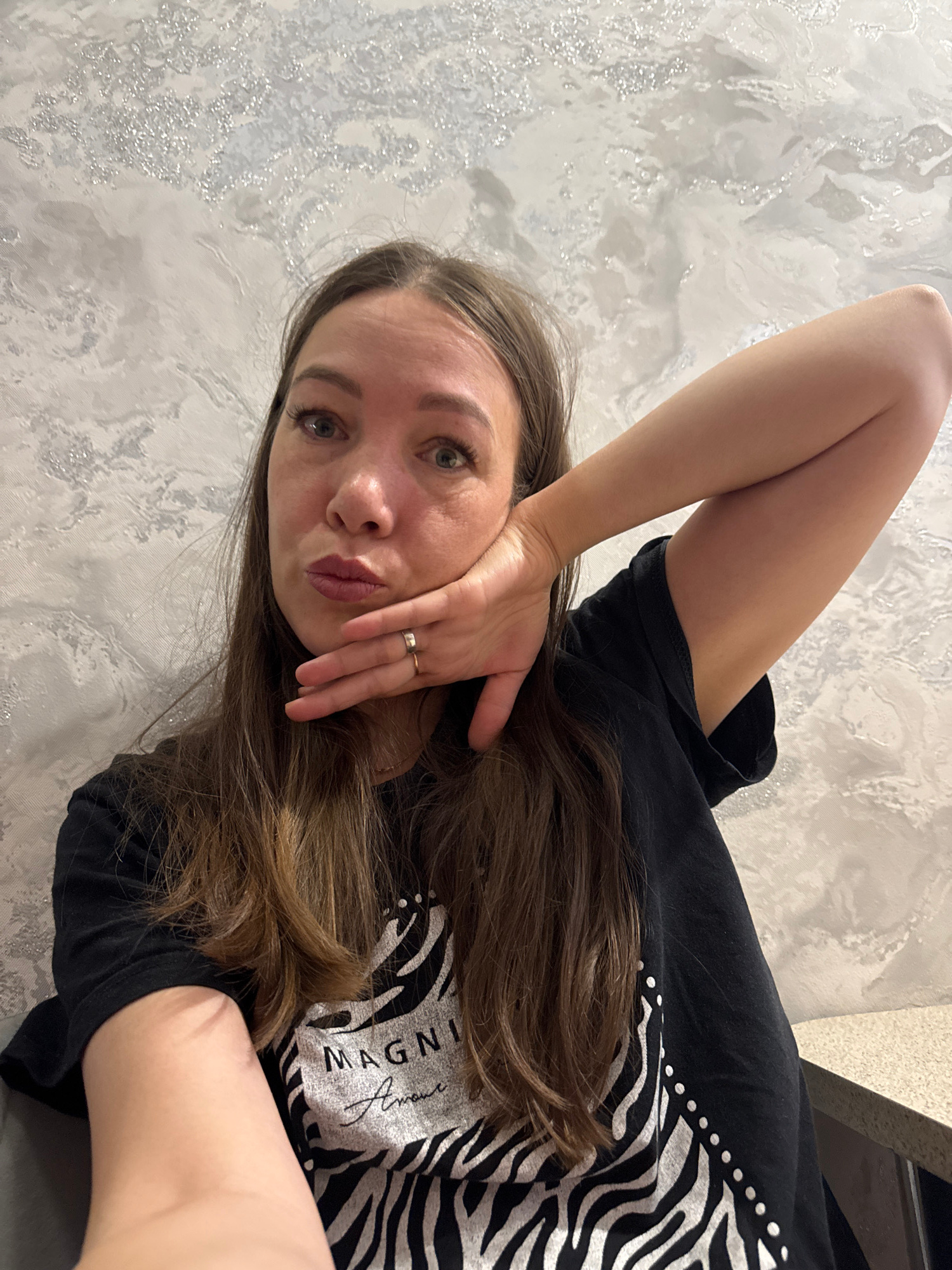 A woman is taking a selfie. She is light-skinned with brown hair and is wearing a black t-shirt with a zebra print design on the front. She is holding her hand up to her face, and she has two rings on…read more