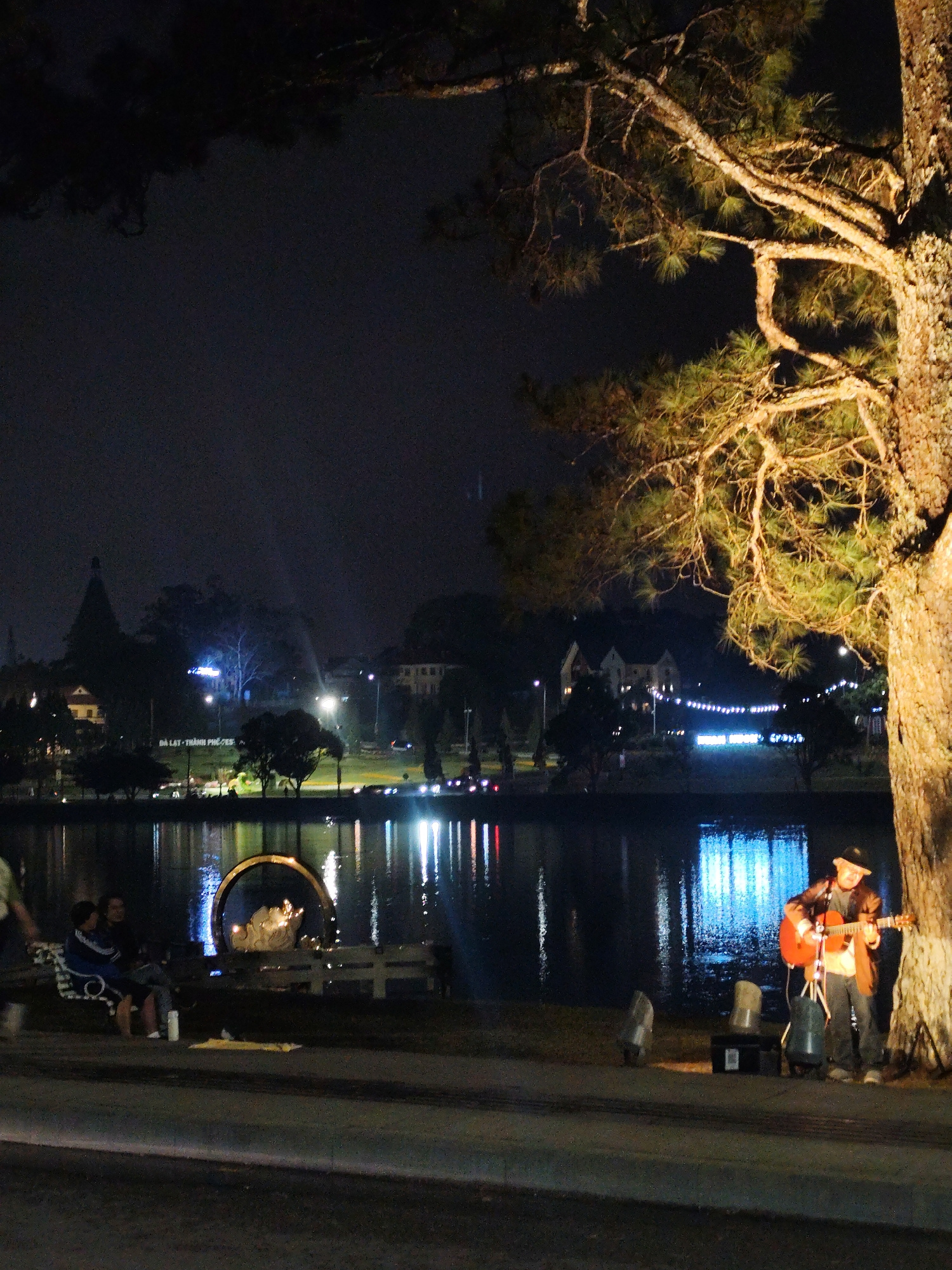 At night in Xuân Hương, Đà Lạt, Vietnam, a man in a hat and jacket plays a guitar next to a tree, illuminated by a spotlight. Two individuals sit on a bench near a circular structure beside a lake ref…read more