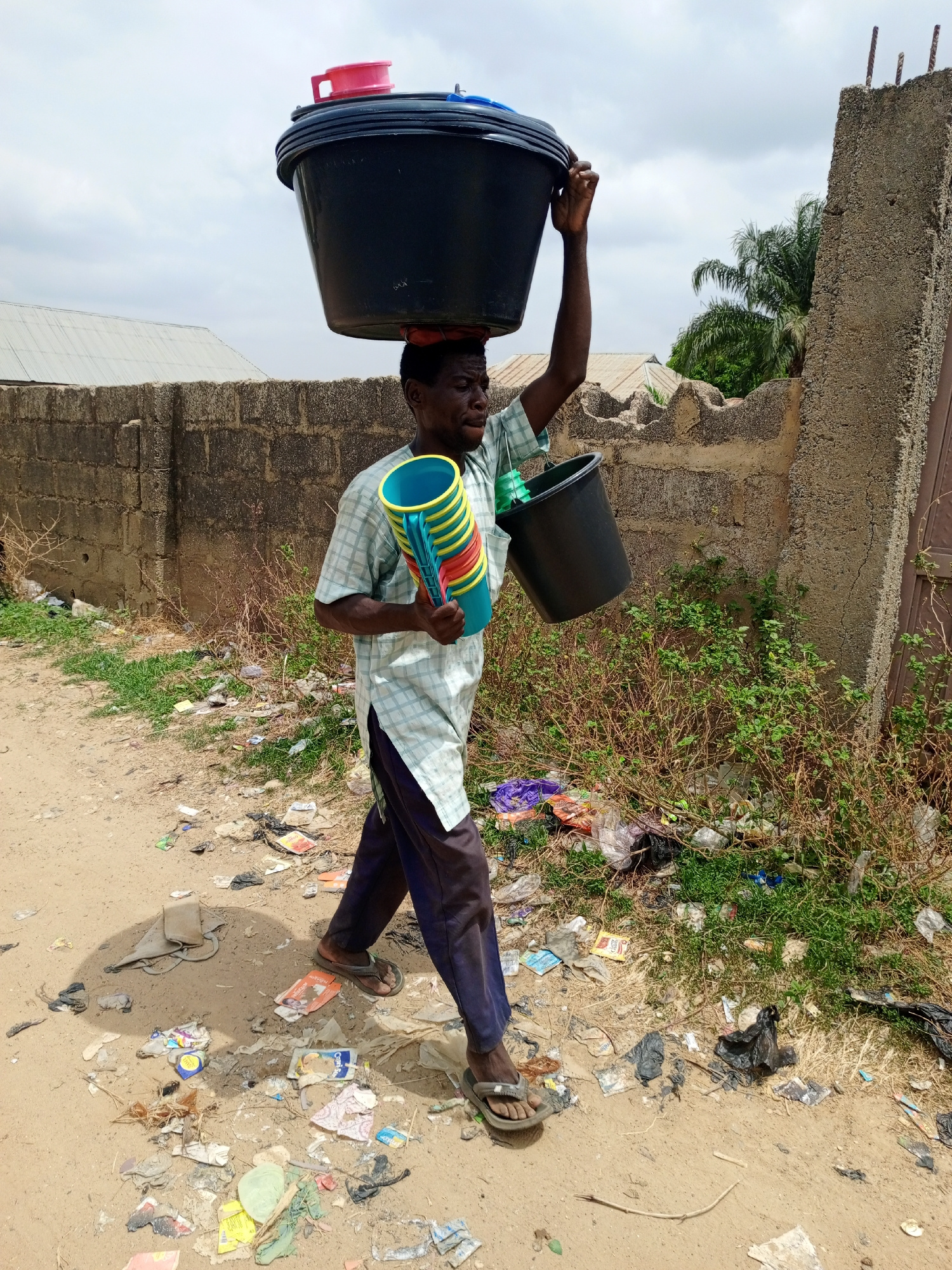 In Keffi, Nigeria, a man carries a stack of colorful plastic cups in his left hand and a black bucket in his right. He balances a larger black bucket on his head. The man wears a light-colored, checke…read more