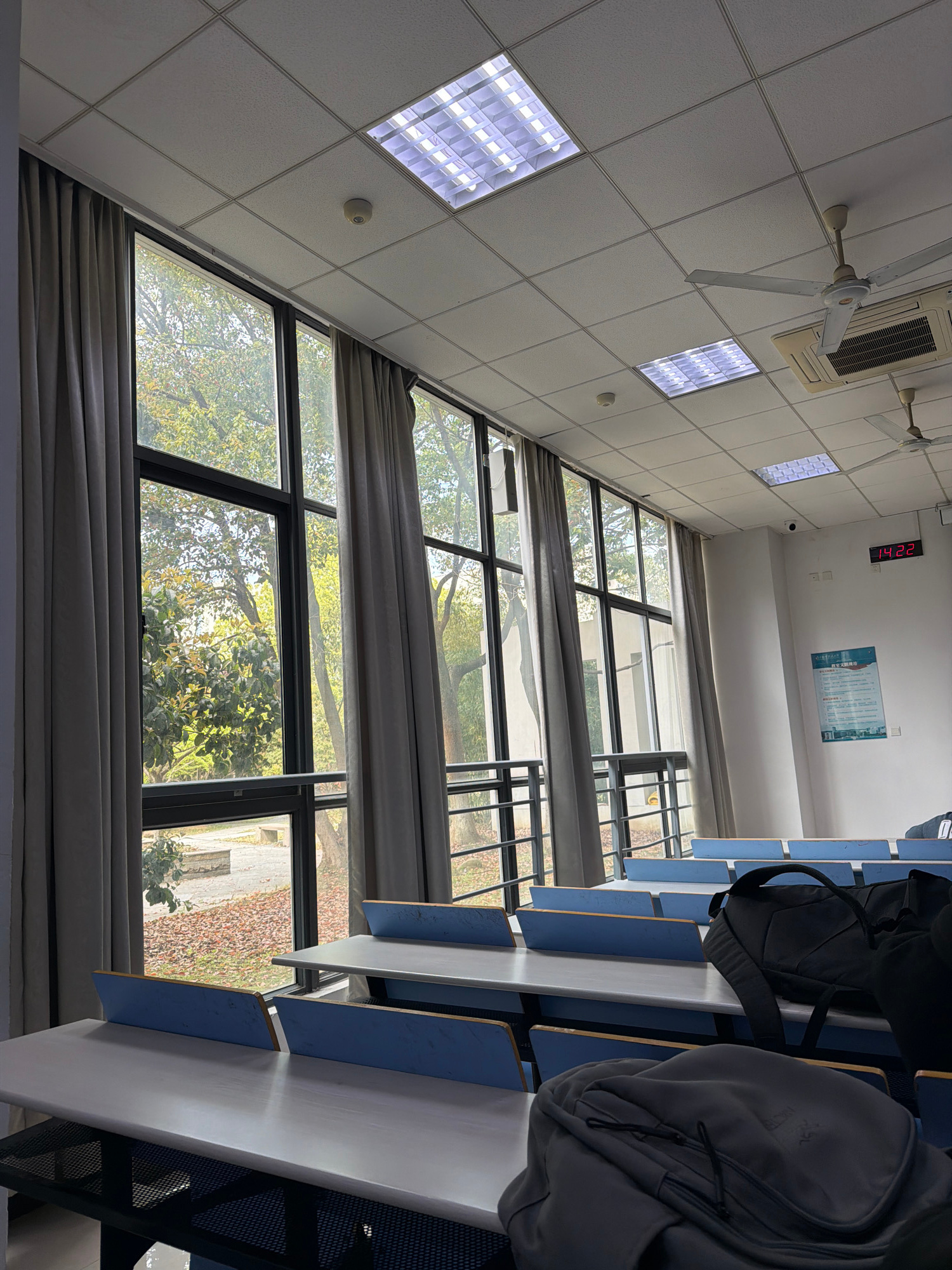 The image shows the interior of a classroom or lecture hall in Jiangning District, China, based on the architecture and surrounding environment visible through the windows. The room features rows of d…read more