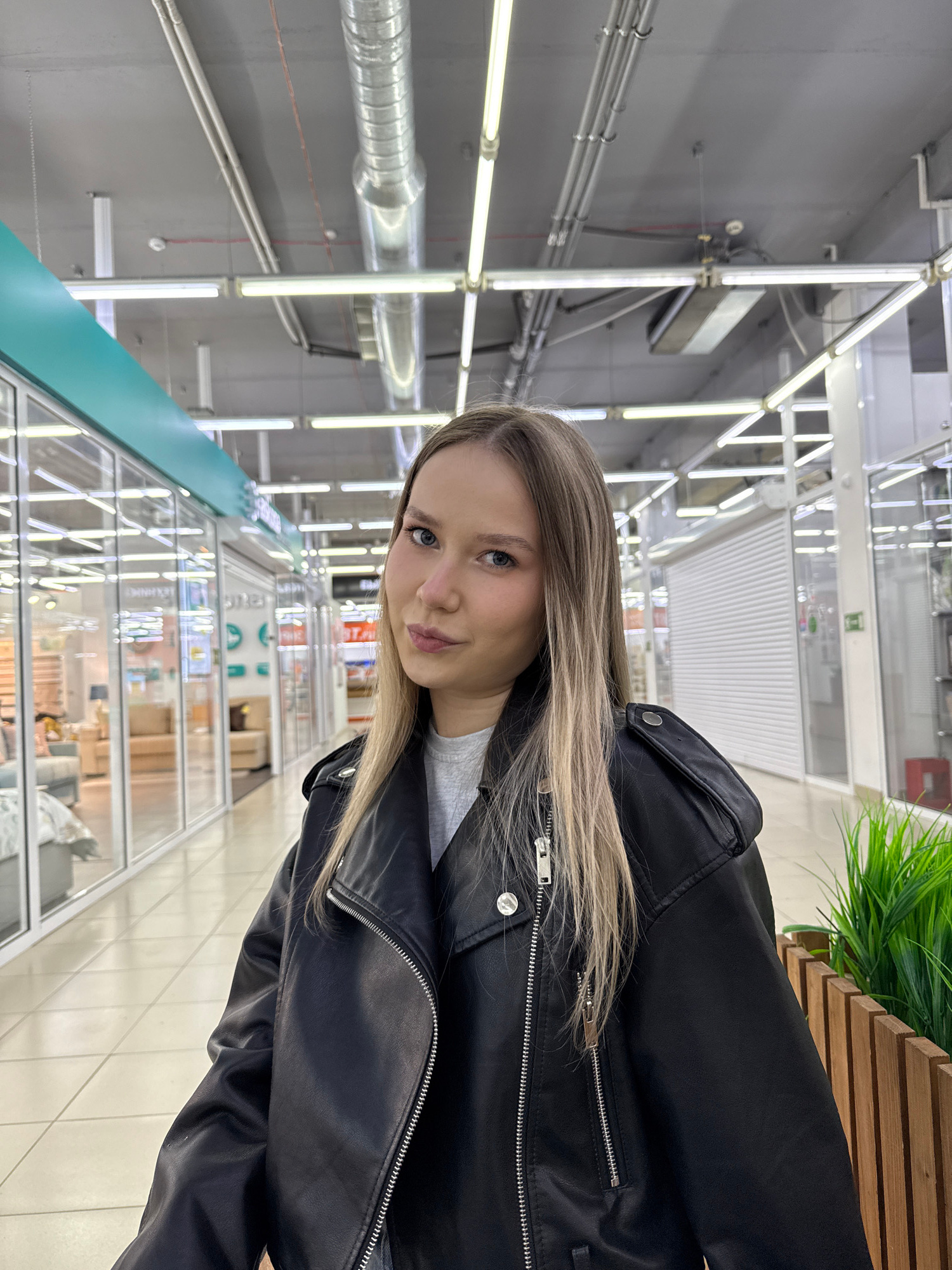 A young woman stands indoors, possibly in a shopping center or large store, judging by the ceiling lighting and storefronts visible in the background. She is wearing a black leather jacket over a gray…read more