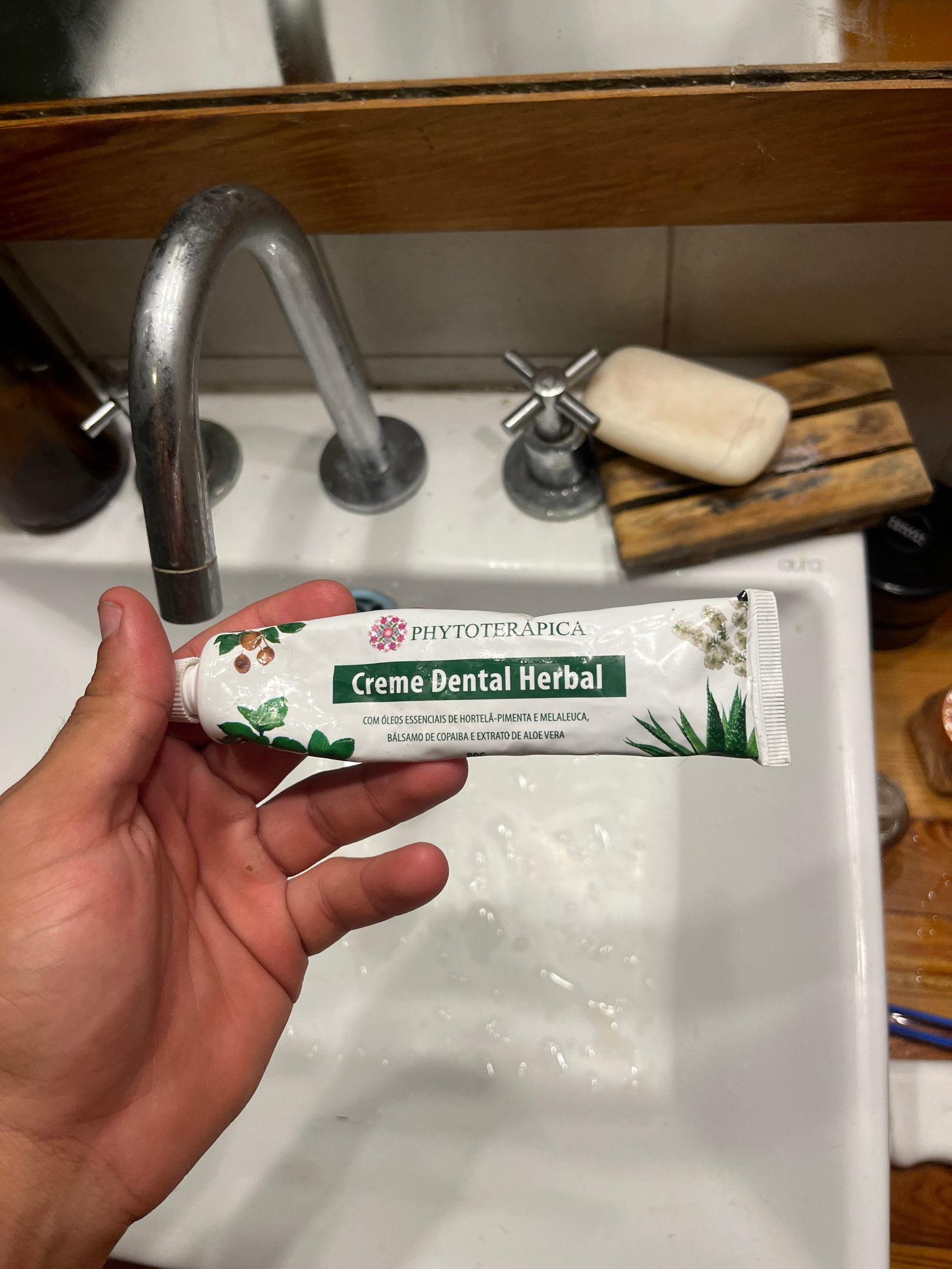 A hand is holding a tube of "Phytoterapica Creme Dental Herbal" toothpaste in front of a bathroom sink. The environment includes a metal faucet, a bar of soap on a wooden rack, and toiletries in the b…read more
