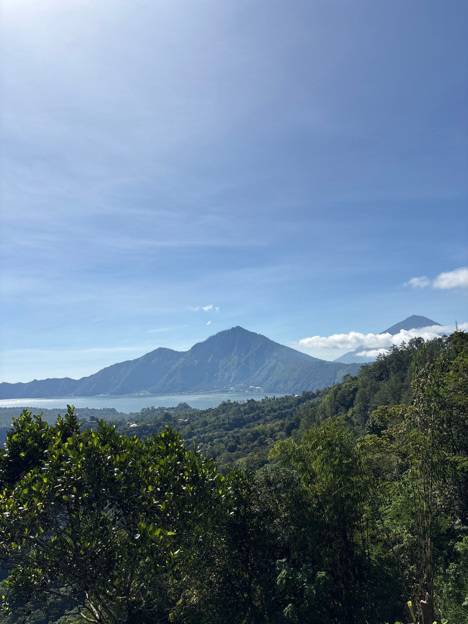 The image captures a landscape scene in Kintamani, Indonesia, featuring mountains and a lake under a clear blue sky. Lush green vegetation covers the mountainsides and frames the view on the right. A…read more
