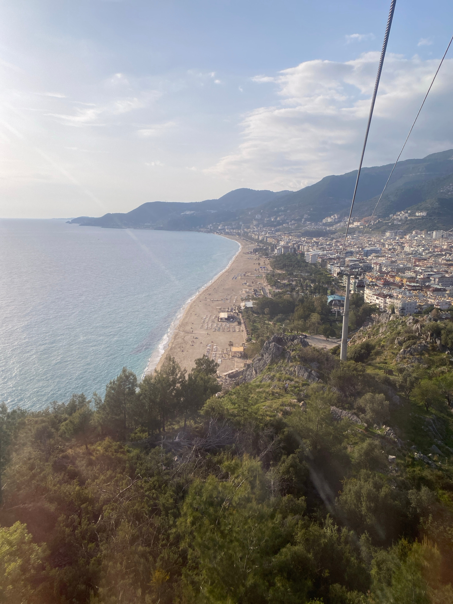 The image shows a view from a cable car in Alanya, Turkey. A long beach stretches along the coast, lined with buildings. The sea is visible, with trees on the right side of the image. A tall mountain…read more