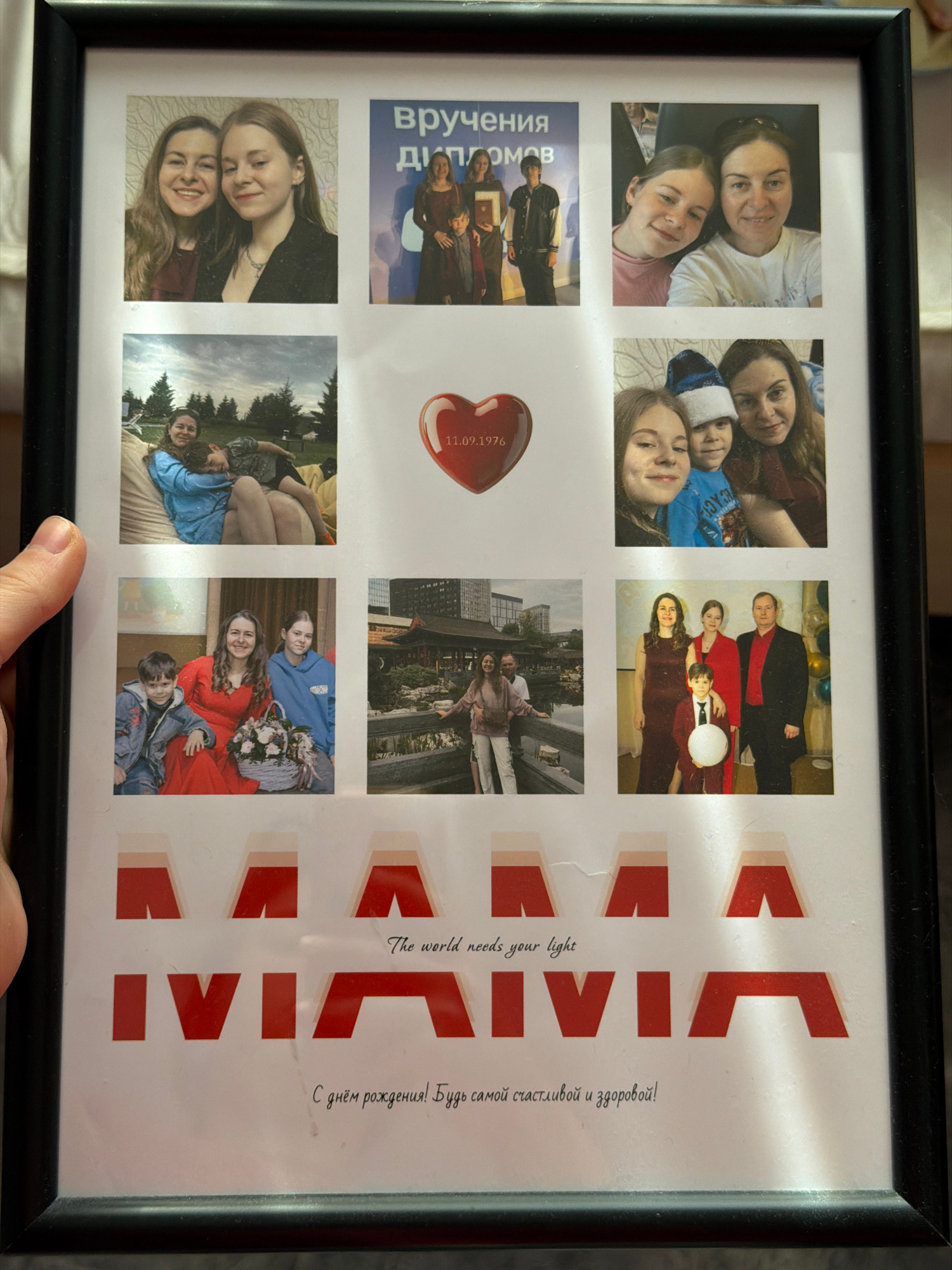 A framed photo collage, oriented vertically, displays a collection of personal photographs, seemingly dedicated to an individual named Vivian. The black frame encloses a grid of eleven smaller images,…read more