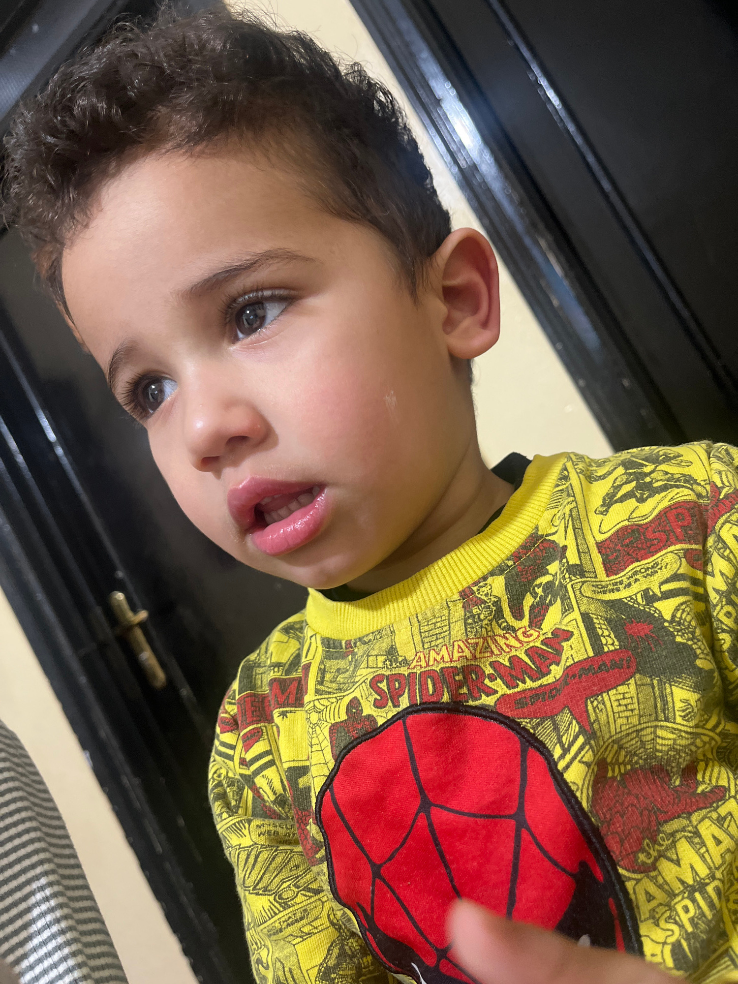 A young boy with dark curly hair, light skin, and large eyes wears a yellow Spider-Man comic-print shirt. He is looking upwards, his mouth slightly open. The background consists of a dark, glossy surf…read more
