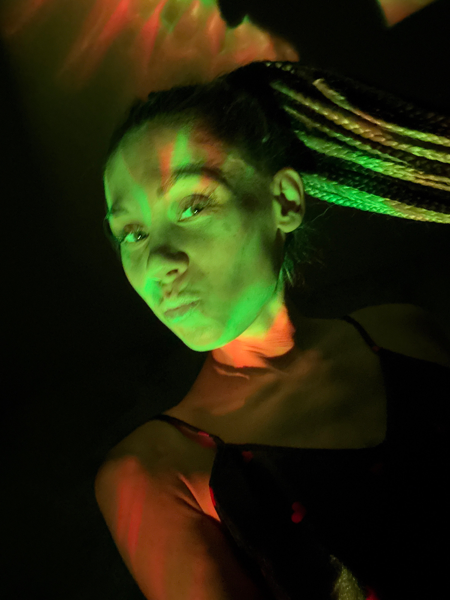 A woman with braided hair is depicted in the dark, under a green light illuminating her face and part of her braids. Red light is cast on her neck and shoulder. She has a piercing in her nose and is w…read more