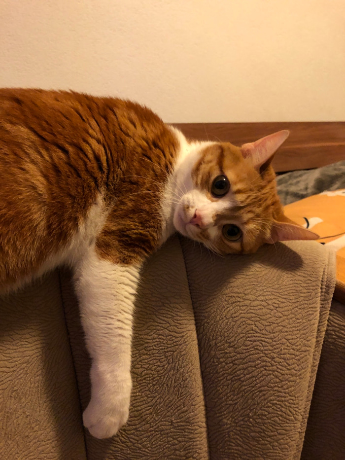 An orange and white cat is resting against a textured, brown-grey couch. The cat's body is primarily orange, with white markings on its face, chest, and a single paw extending horizontally. The cat is…read more