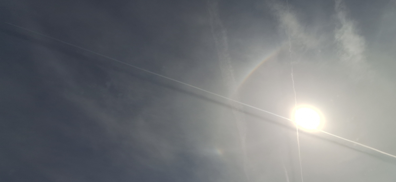 The image shows a bright sun with contrails in a cloudy sky. A faint, partial halo is visible around the sun. The location is not discernible from the image; there is no information to determine if th…read more