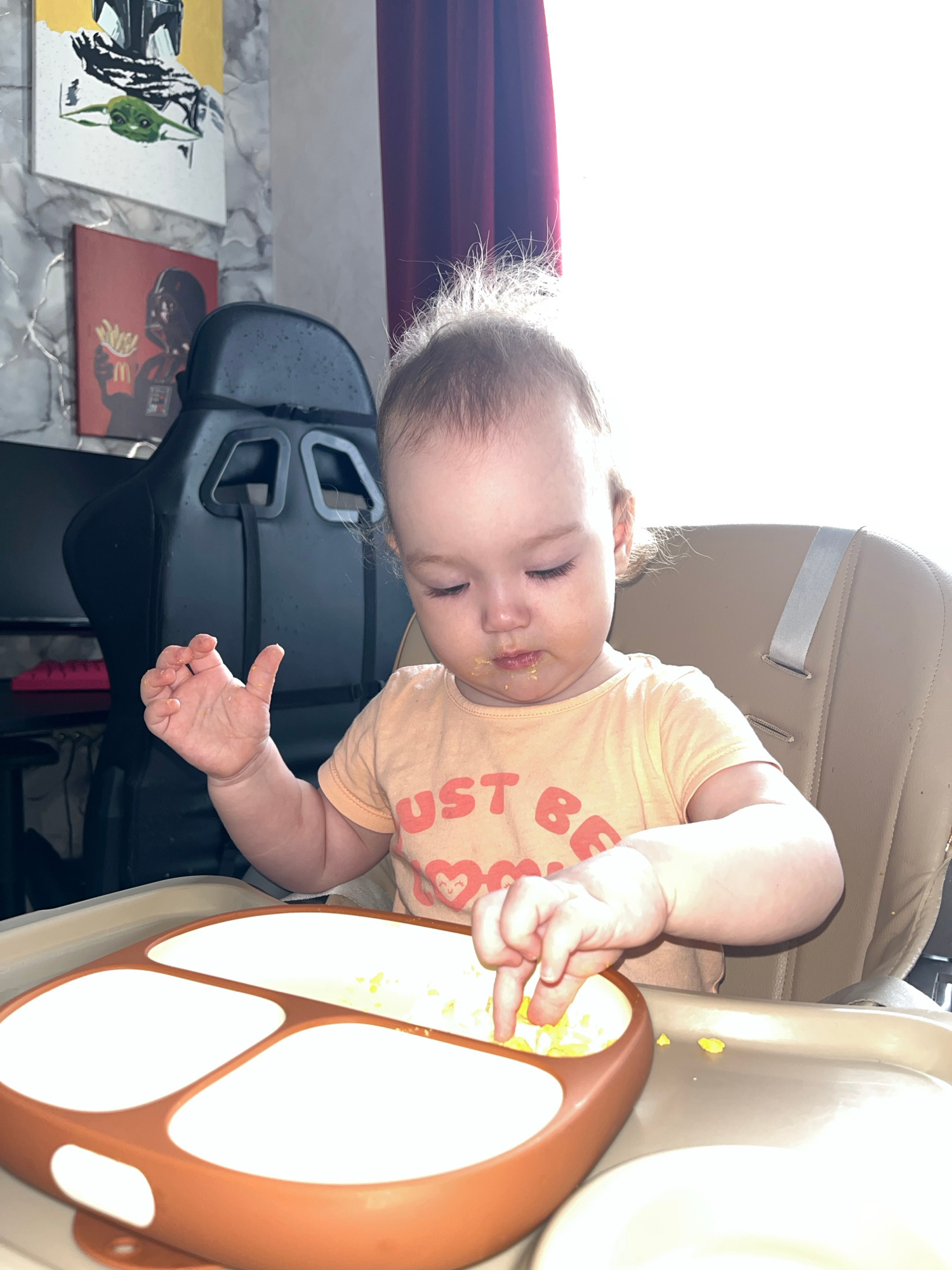 A baby is sitting in a high chair, eating food from a divided plate. The baby has food around their mouth and on their hands. The chair is positioned next to a black gaming chair, and in the backgroun…read more