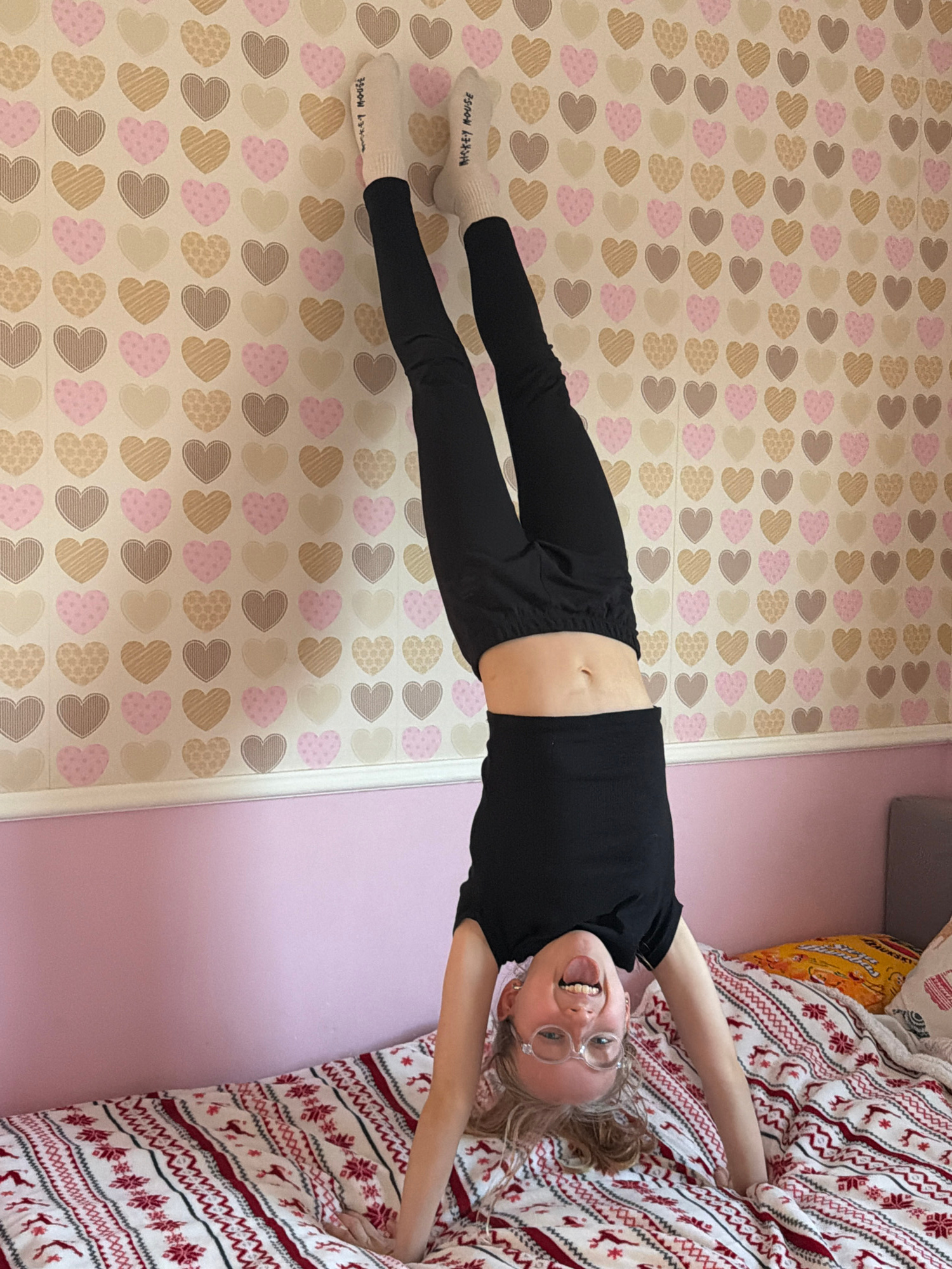 A young woman is lying on her back on a bed in a room, sticking her tongue out and smiling. She is wearing glasses, a black t-shirt, black sweatpants, and white socks that say "Mickey Mouse" on them.…read more