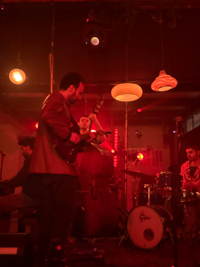 Four male musicians are depicted performing on a stage under dominant red lighting. From left to right: a partially visible male individual with dark hair and beard operates a keyboard; a male individ…read more