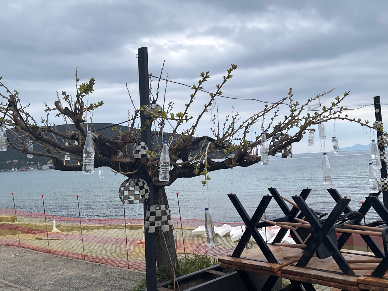 The scene depicts an outdoor space, likely a restaurant or cafe patio, in Nea Peramos, Greece. The location is suggested by the view of the sea and distant land. In the foreground, a bare tree with a…read more
