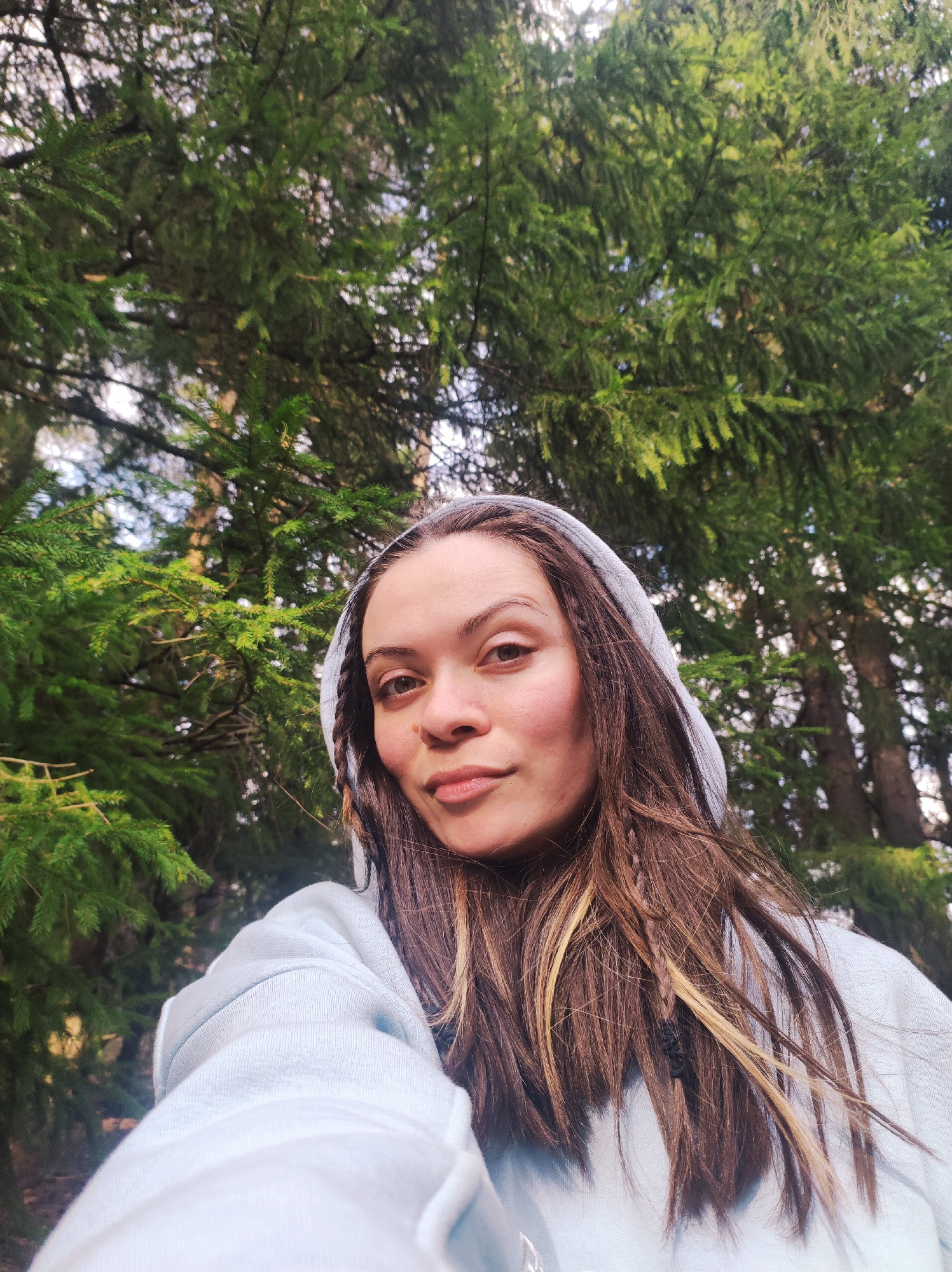 A young woman takes a selfie in a forest setting in Фоки, Russia. She is positioned in the foreground, looking directly at the camera with a calm and natural expression. Her long, dark brown hair, fea…read more