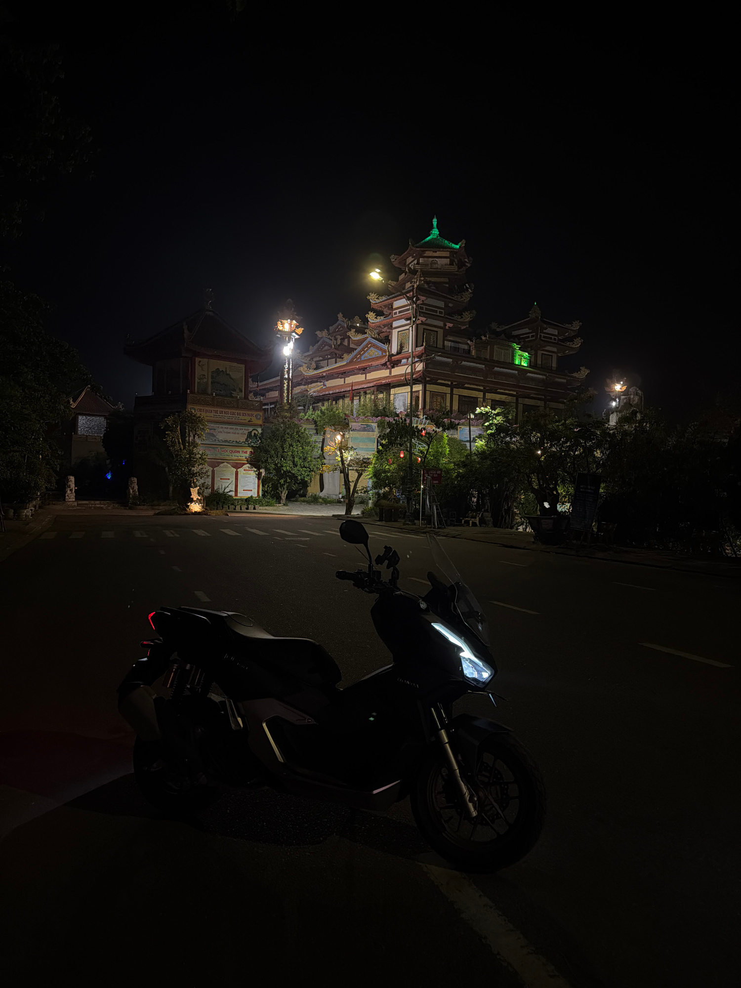 Captured at night in the city of Đà Nẵng, Vietnam, the image features a motorcycle parked on the side of a road. In the background, a brightly illuminated and intricate Buddhist temple or architectura…read more