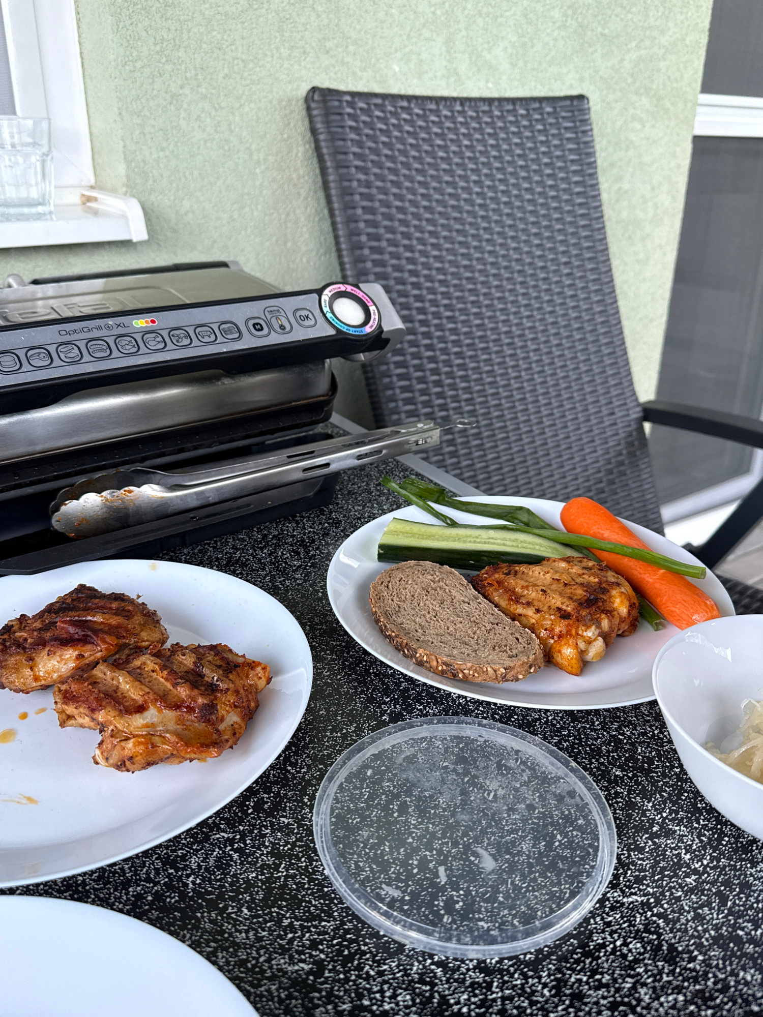 An overhead, angled shot captures a meal being prepared or served outdoors in Biely Kostol, Slovakia. The scene features a variety of food items and cooking equipment arranged on a dark, speckled coun…read more