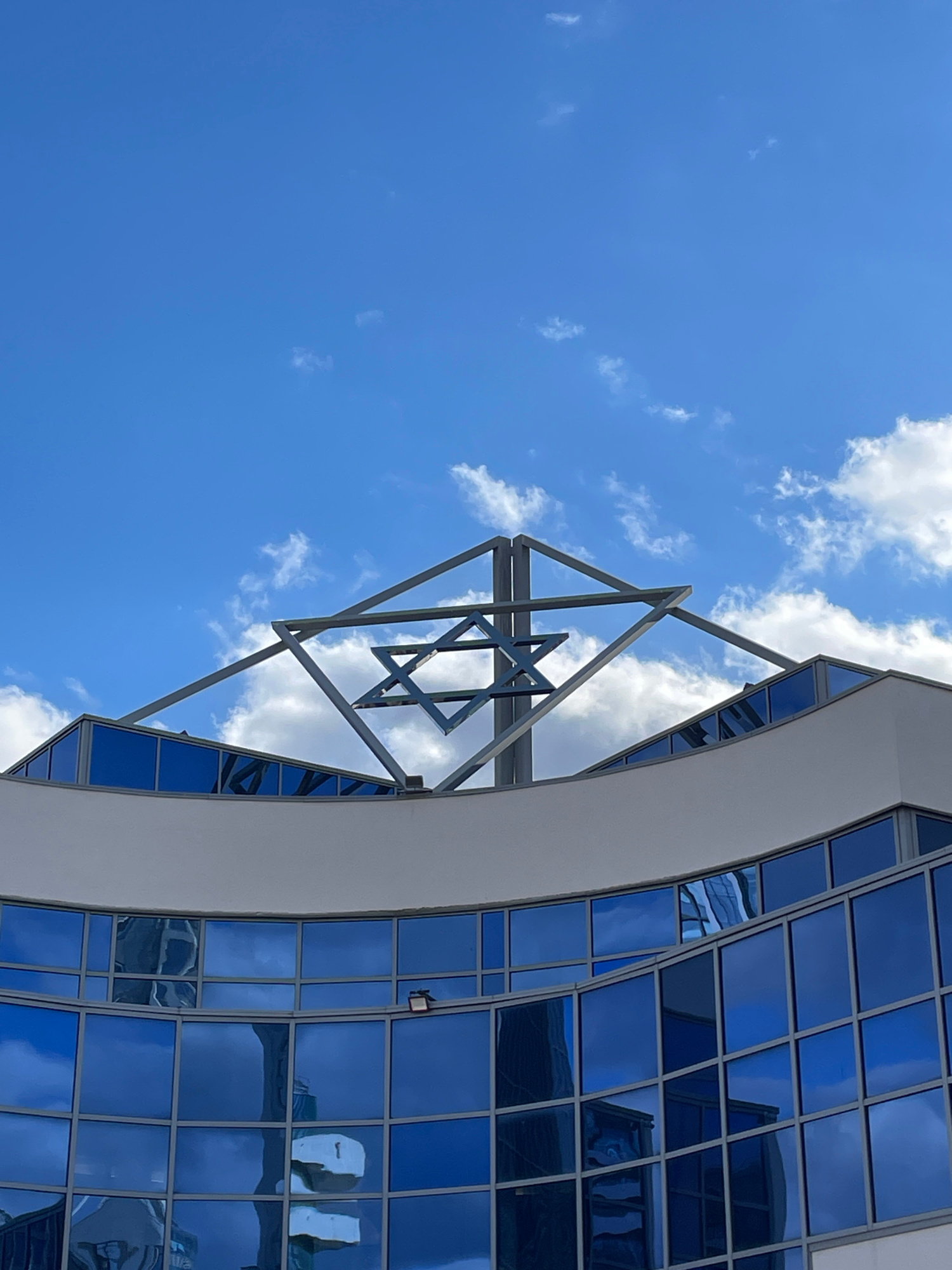 The image shows a portion of a building in Yekaterinburg, Russia. The building has a curved facade with blue-tinted windows. A metal structure, possibly an architectural detail, extends from the build…read more