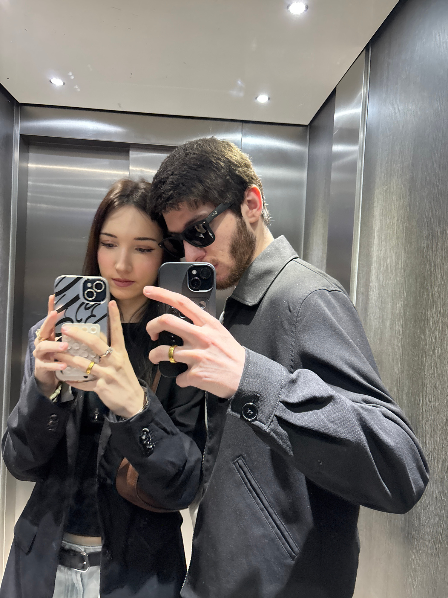 Two individuals are taking a selfie in what appears to be an elevator. The man, positioned at the top of the frame, has a beard and is wearing sunglasses and a dark jacket. The woman, below him, holds…read more