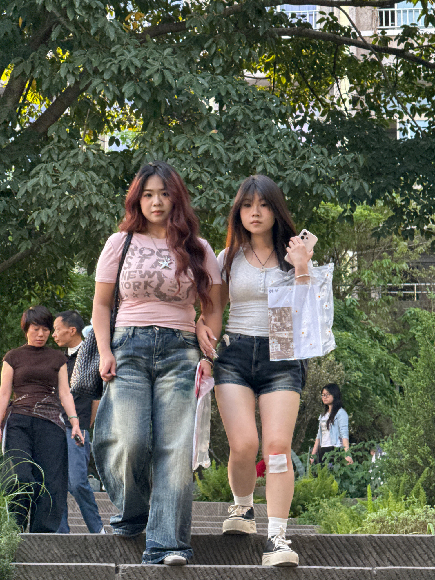 Two young women are standing side-by-side outdoors, likely in a park or public area, with trees and other vegetation visible in the background. The woman closer to the camera is wearing a white top an…read more